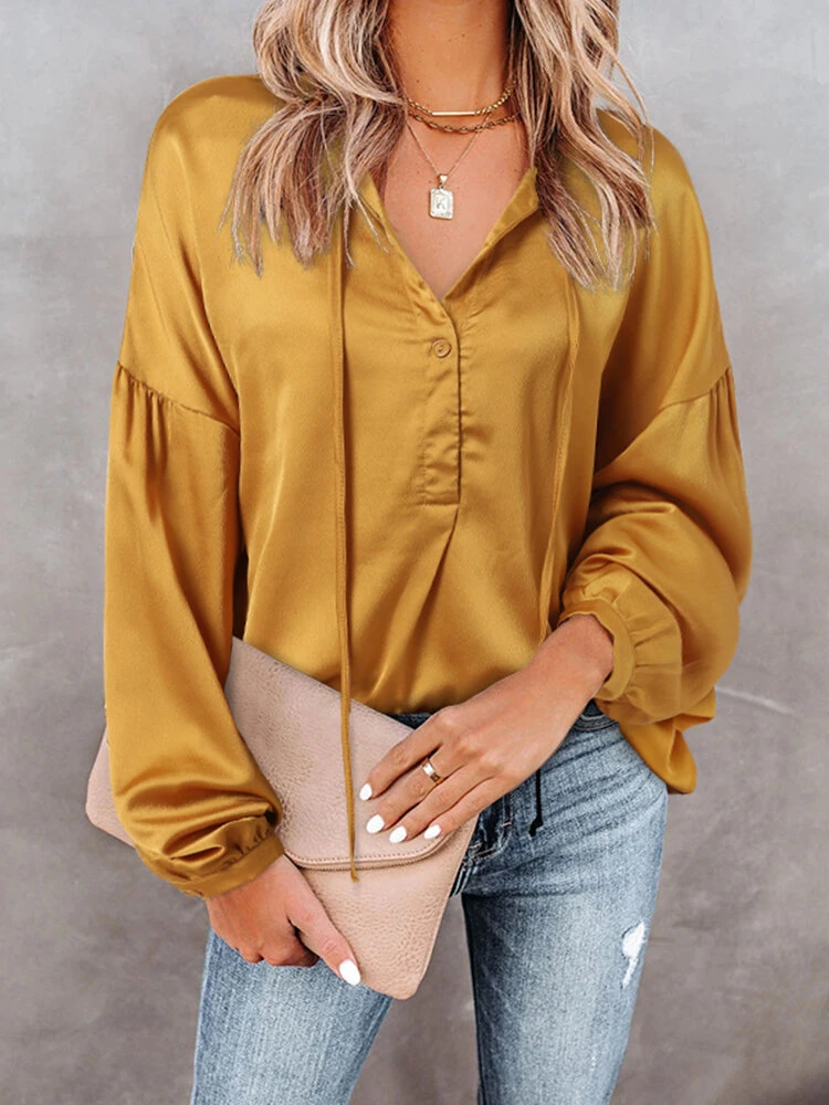 Be the first to review “Solid Satin Long Sleeve Tie Front V-neck Blouse” Cancel reply