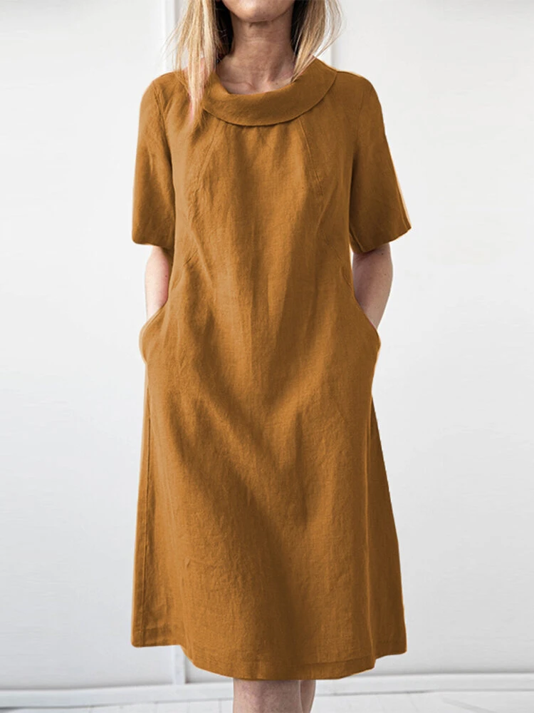 Color: Yellow, Pink Style: Vintage Occasion: Everyday Material: Cotton, Linen Pattern: Plain Design Element: Pocket Season: Summer Collar: Lapel Collar Sleeves Length: Short Sleeve Package Included:1*Dress
