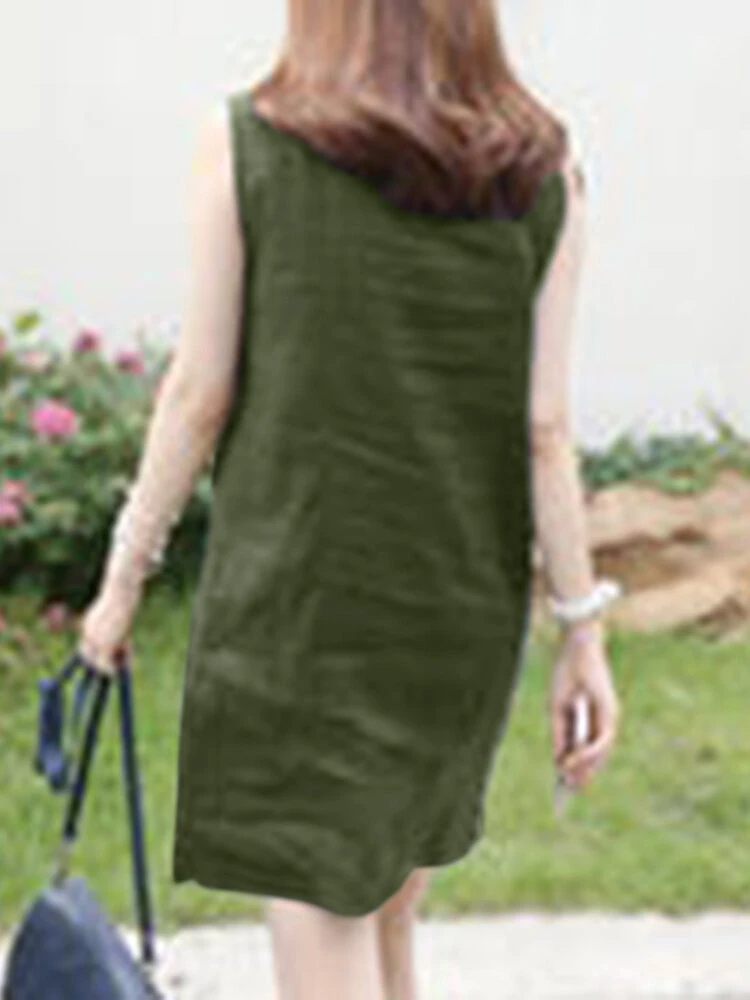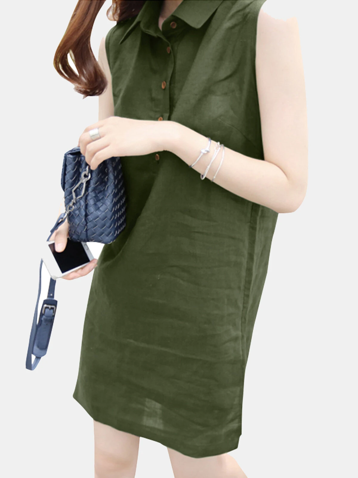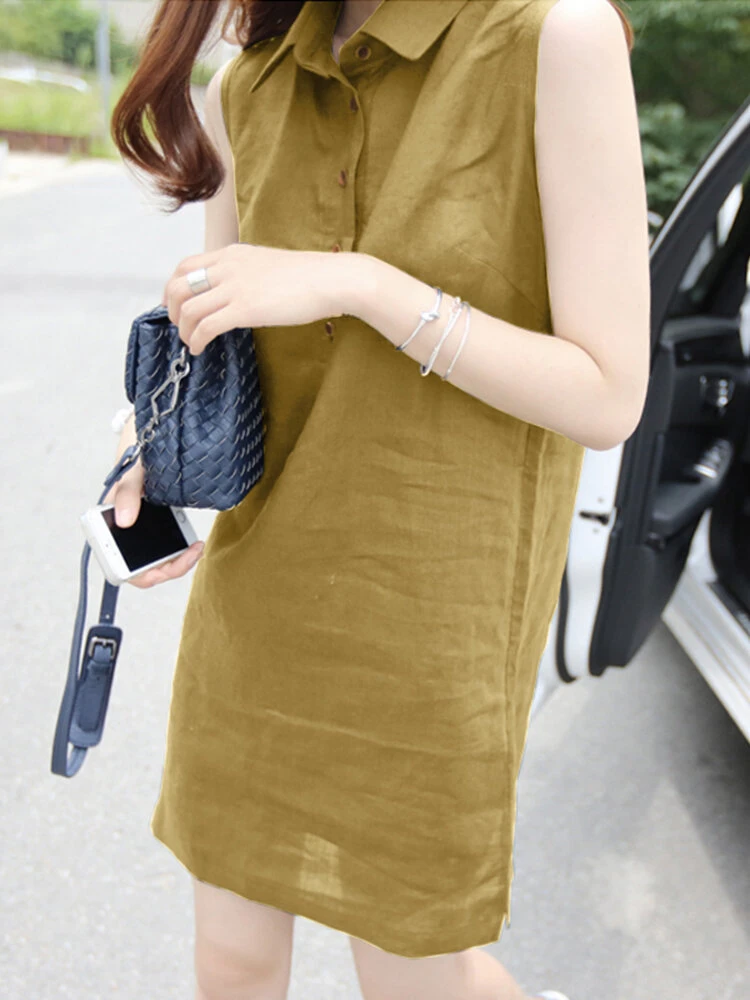 Color: Green, Yellow, Pink Style: Vintage Occasion: Everyday Material: Cotton, Linen Pattern: Plain Design Element: Button Front Season: Summer Collar: Lapel Collar Sleeves Length: Sleeveless Package Included:1*Dress