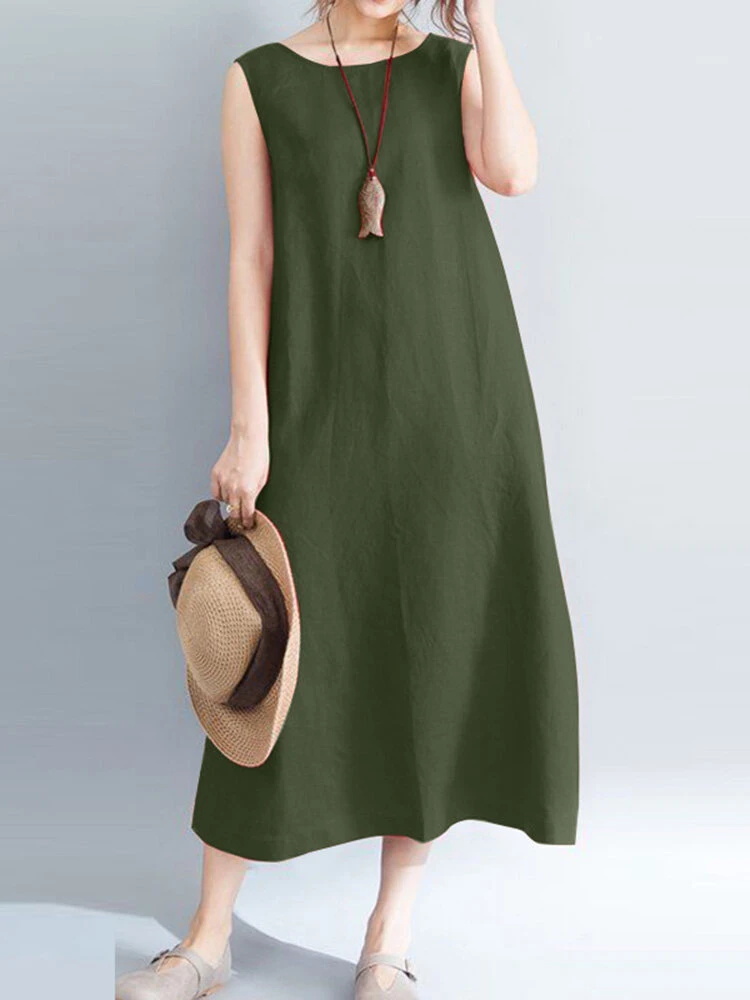 Solid Sleeveless Crew Neck Vintage Dress For Women