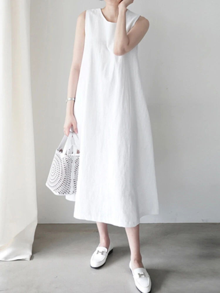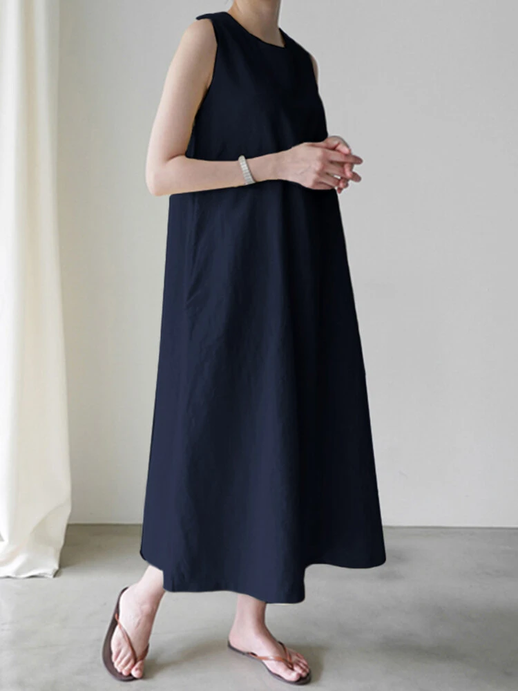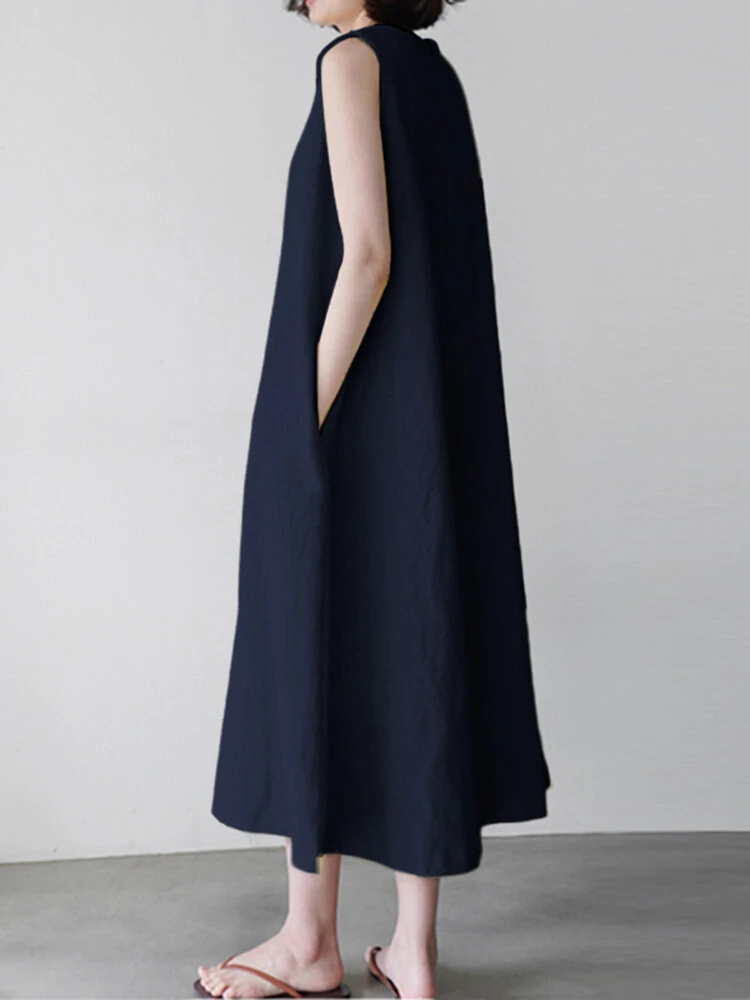 Solid Sleeveless Pocket Casual Crew Neck Dress