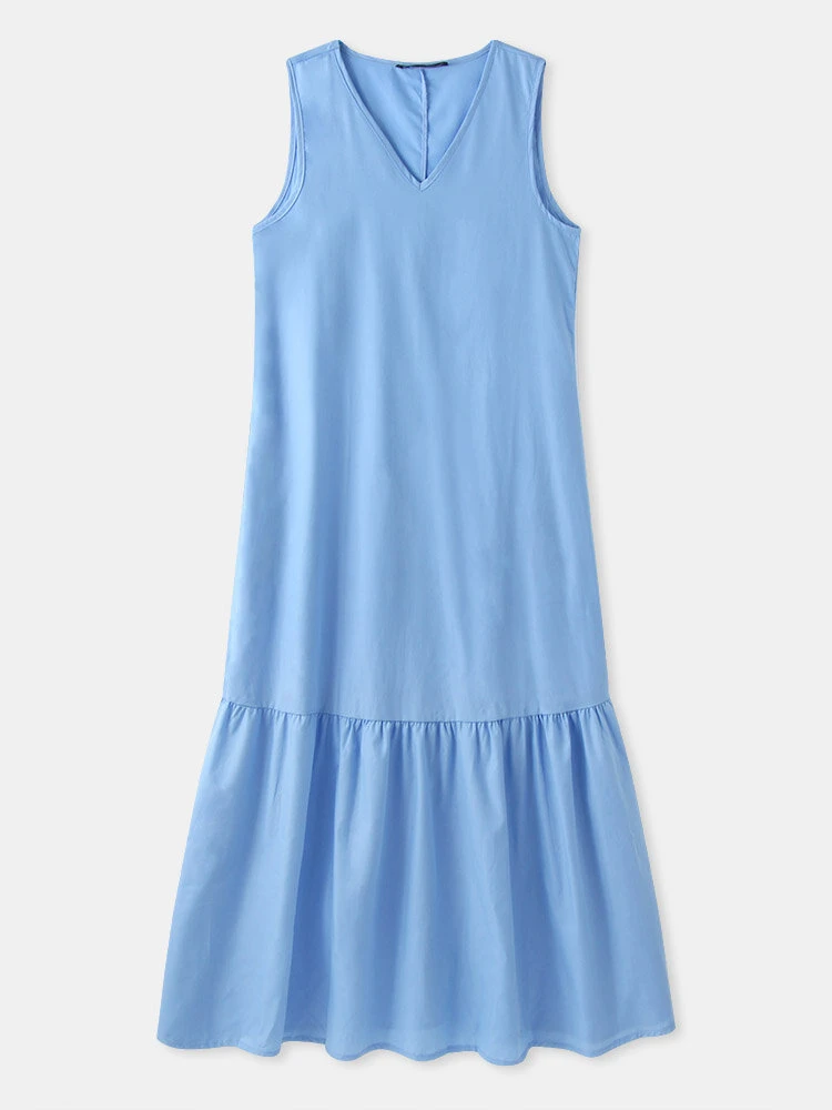 Solid Sleeveless V-neck Plus Size Ruffle Long Dress