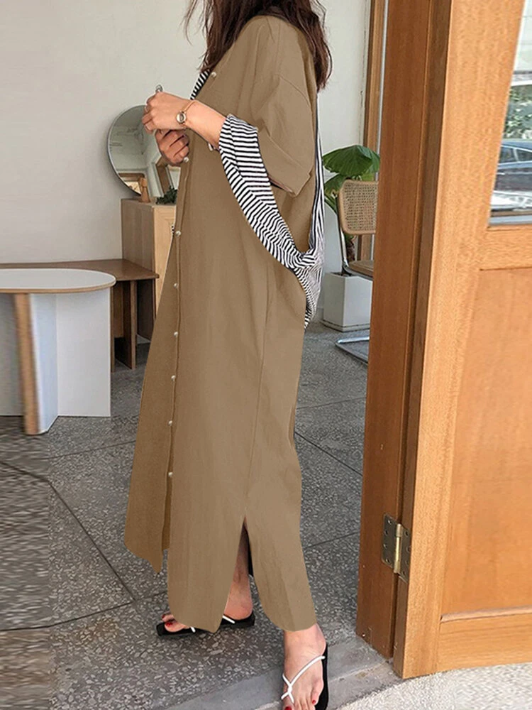 Color: Khaki, Black, Blue Style: Casual Occasion: Everyday Material: Polyester Pattern: Plain Design Element: Button Front, Pocket Season: Autumn, Spring Collar: Lapel Collar Hem Design: Slit Hem Sleeves Length: 3/4 Length Sleeve Length: Maxi Package Included:1*Dress
