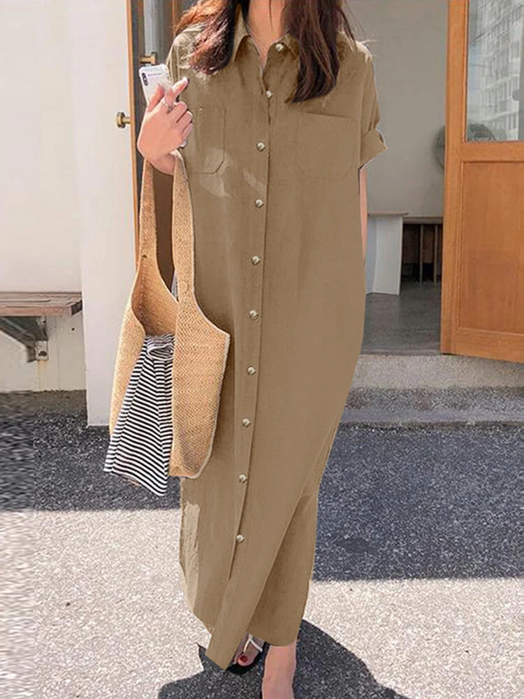Solid Slit Pocket Button Front Lapel Maxi Shirt Dress