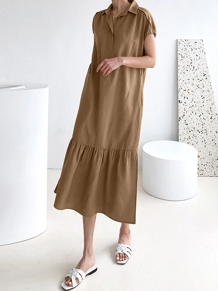 Color: Khaki, Black, Green Style: Casual Occasion: Office chic Material: Cotton, Linen Design Element: Pocket Season: Summer Collar: Lapel Collar Hem Design: Slit Hem Sleeves Length: Short Sleeve Package Included:1*Dress