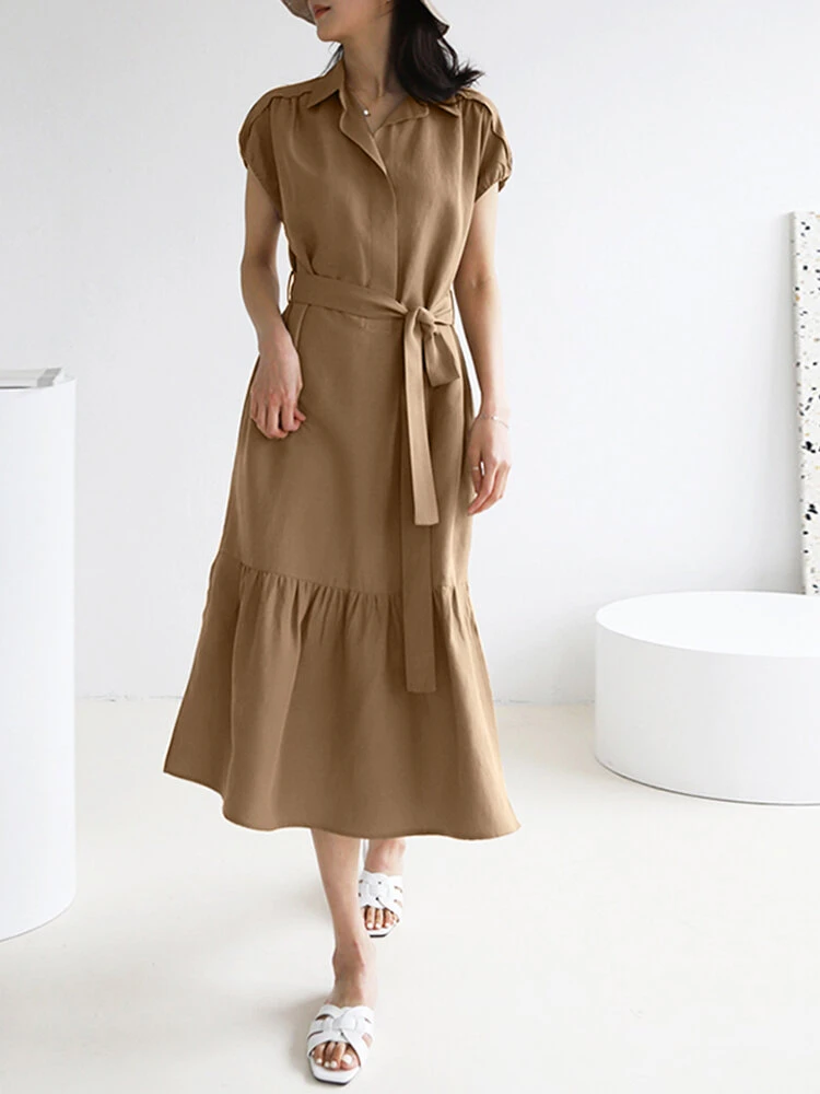 Solid Slit Pocket Lapel Short Sleeve Dress With Belt