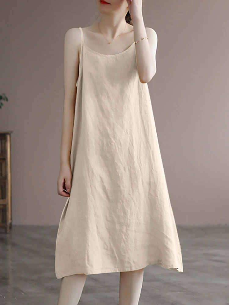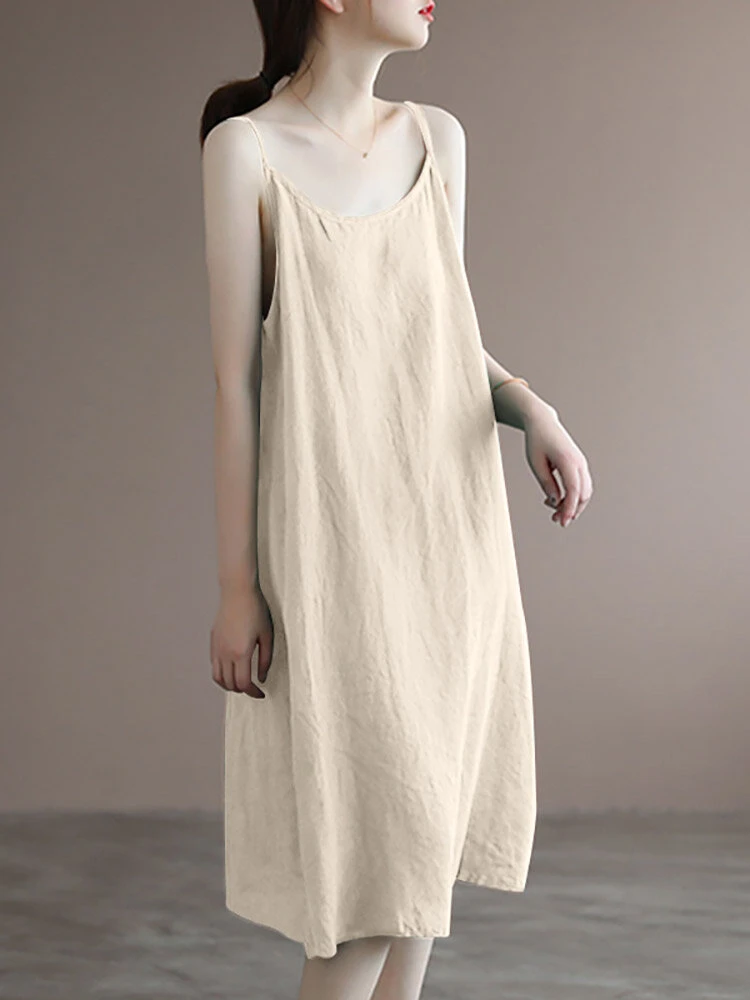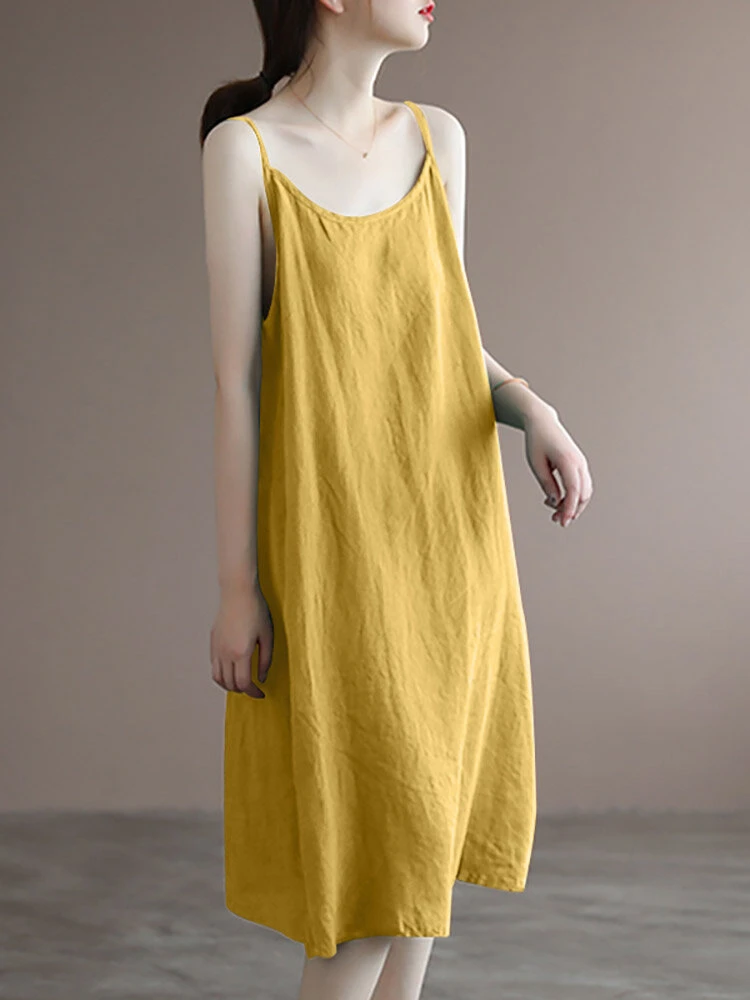 Color: Navy, Beige, Yellow Style: Casual Occasion: Everyday Material: Linen, Cotton Pattern: Plain Season: Summer Collar: Spaghetti Strap Sleeves Length: Sleeveless Length: Midi Package Included:1*Dress