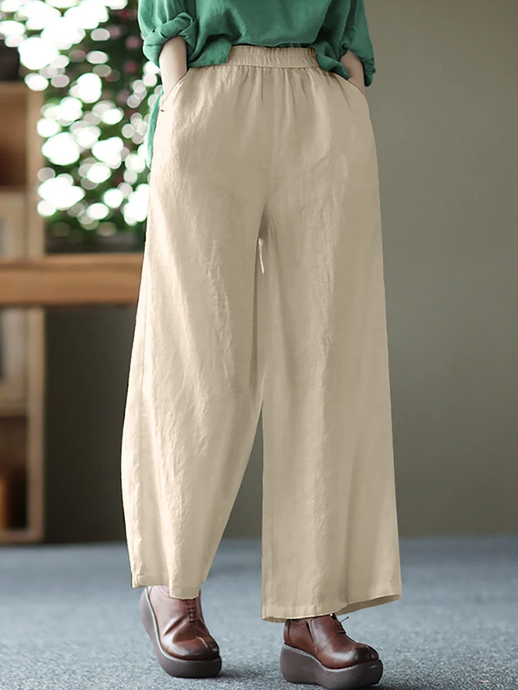 Solid Wide Leg Pocket Elastic Waist Cotton Pants