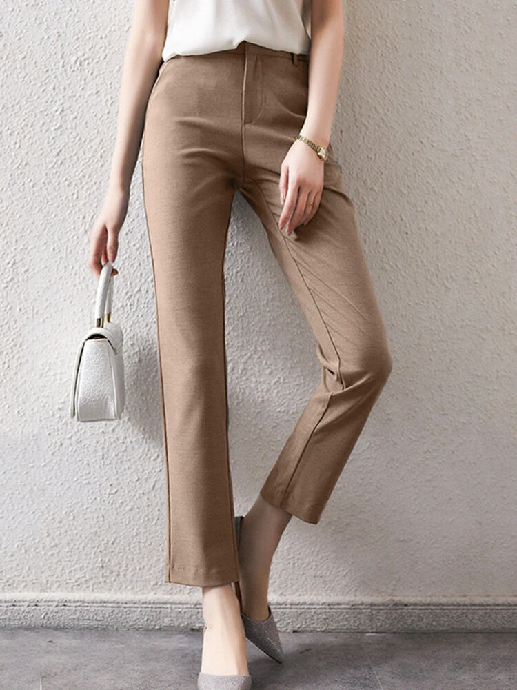 Solid Zip Front Casual Pants For Women