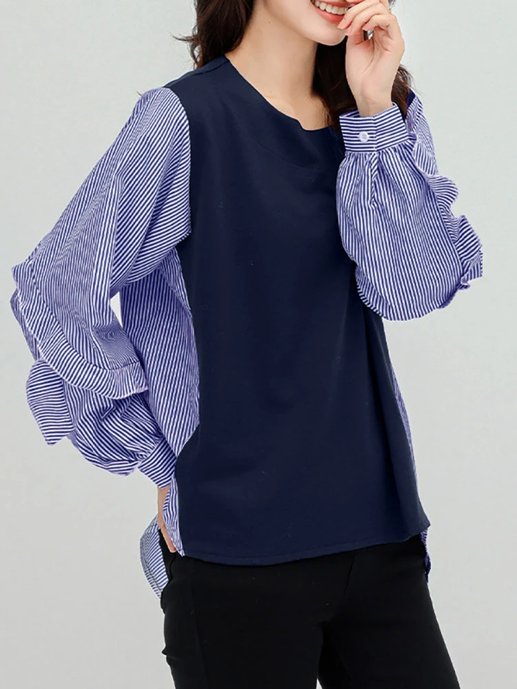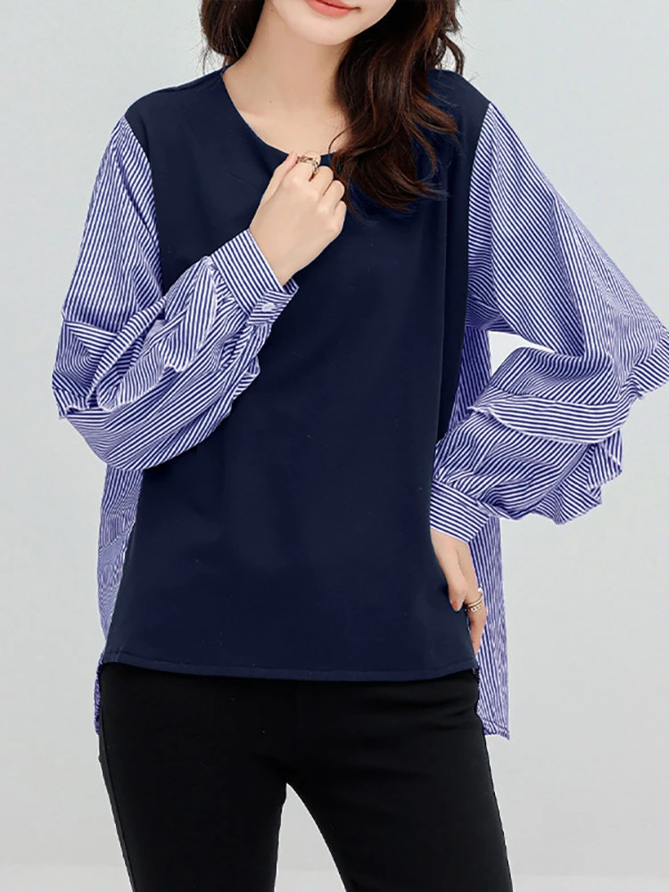 Stripe Patchwork High-low Long Sleeve Crew Neck Blouse