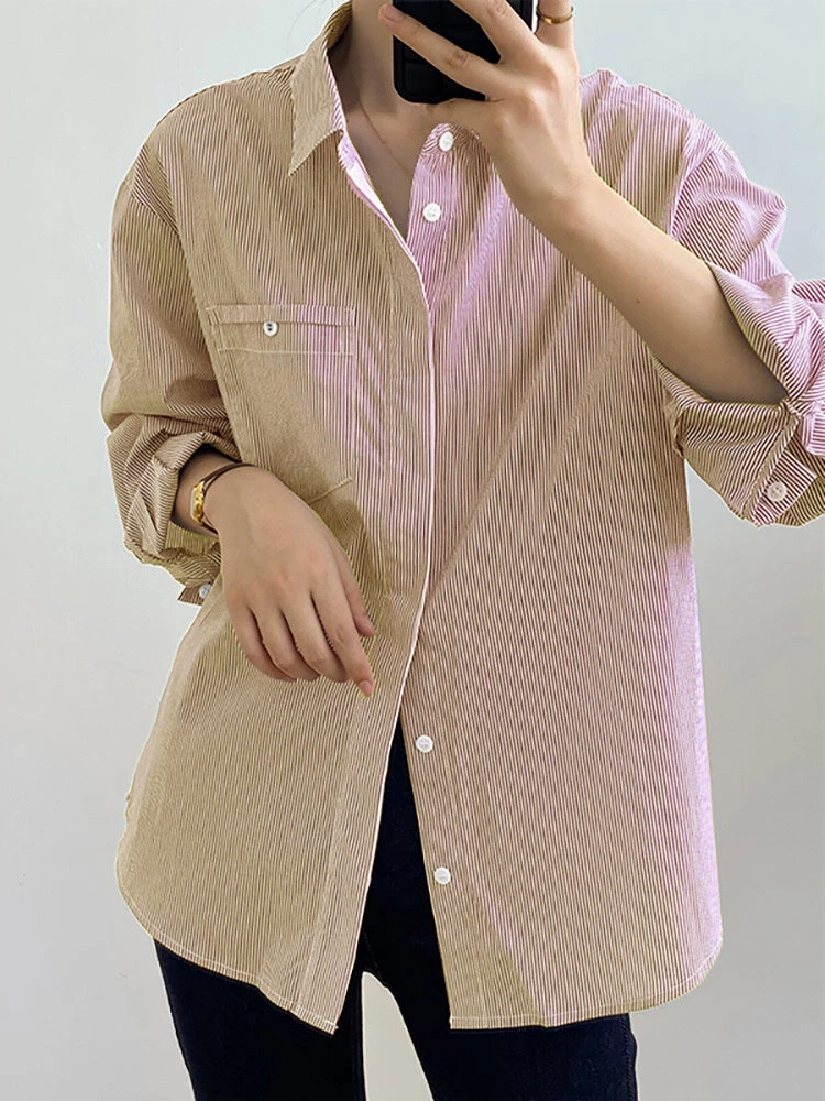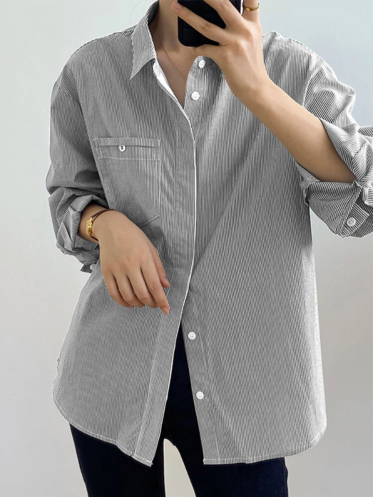 Color: Khaki, Blue, Black Material: Polyester Pattern: Striped Occasion: Office chic Style: Casual Sleeves Length: Long Sleeve Collar: Lapel Collar Season: Autumn, Spring Design Element: Button Front Package Included:1*Shirt