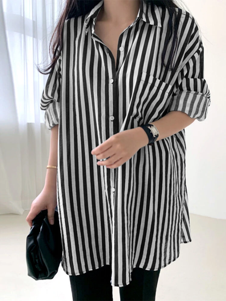 Color: Blue, Black Material: Polyester Pattern: Striped Occasion: Everyday Style: Casual Sleeves Length: Long Sleeve Collar: Lapel Collar Fit Type: Loose Season: Autumn, Spring Design Element: Pocket, Button Front Package Included:1*Shirt