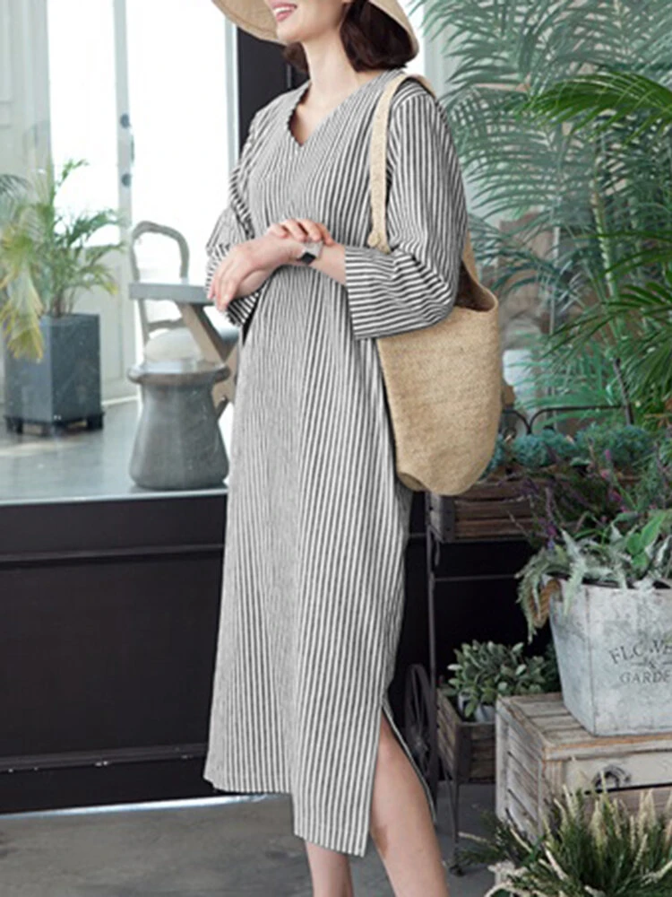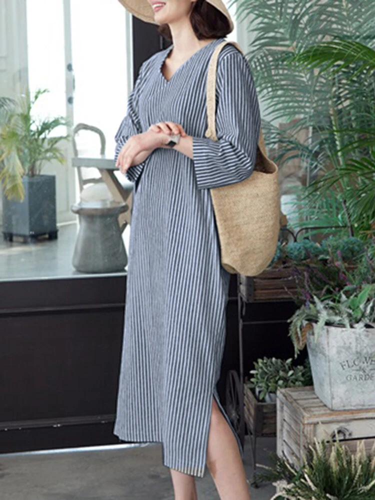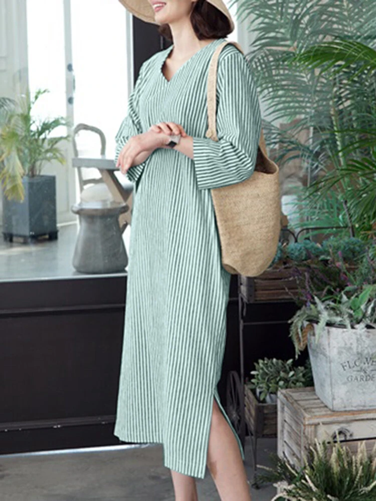 Color: Black, Blue, Green Style: Casual Occasion: Everyday Material: Polyester Pattern: Striped Design Element: Pocket Season: Spring, Autumn Collar: V-neck Hem Design: Slit Hem Package Included:1*Dress