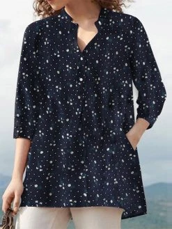Floral Print Button Stand Collar 3/4 Sleeve Blouse For Women