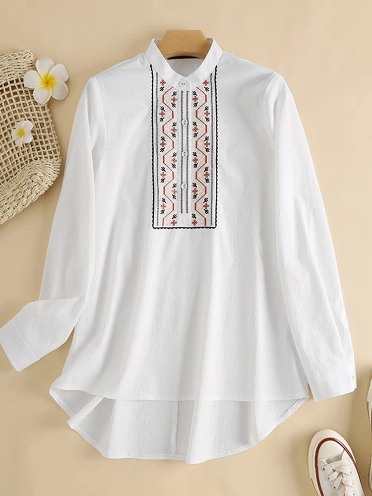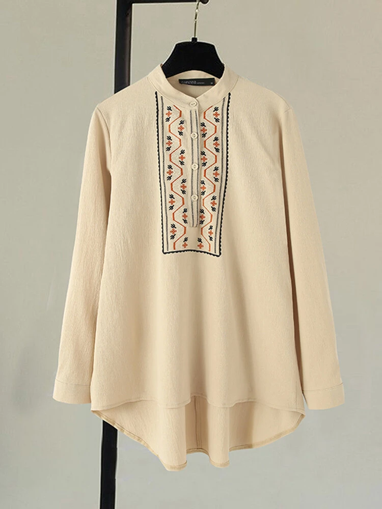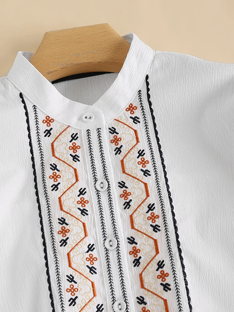 Tribal Embroidery Stand Collar Button Long Sleeve Blouse