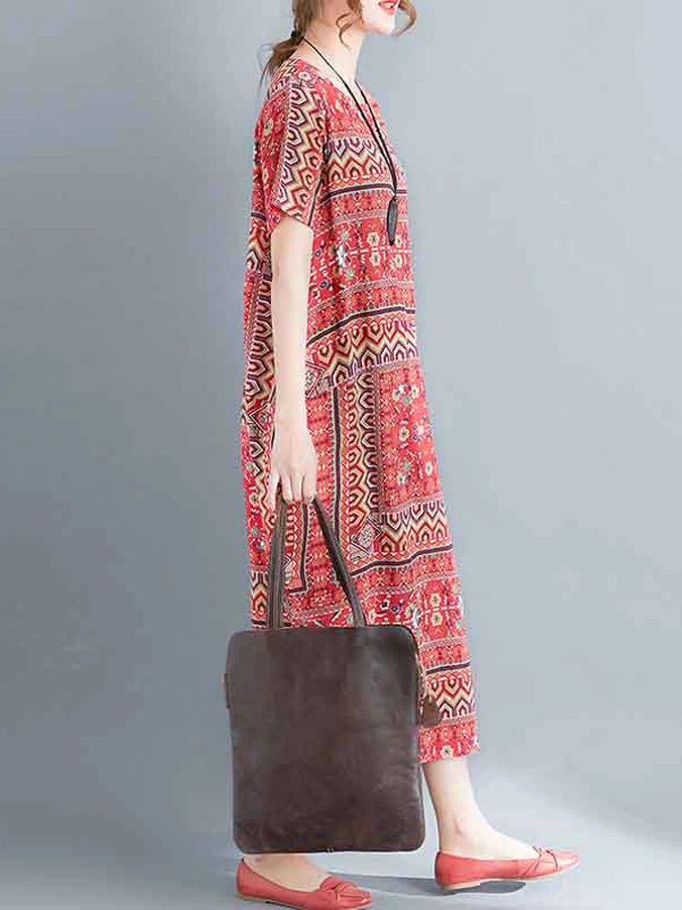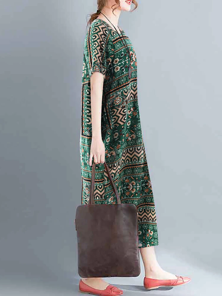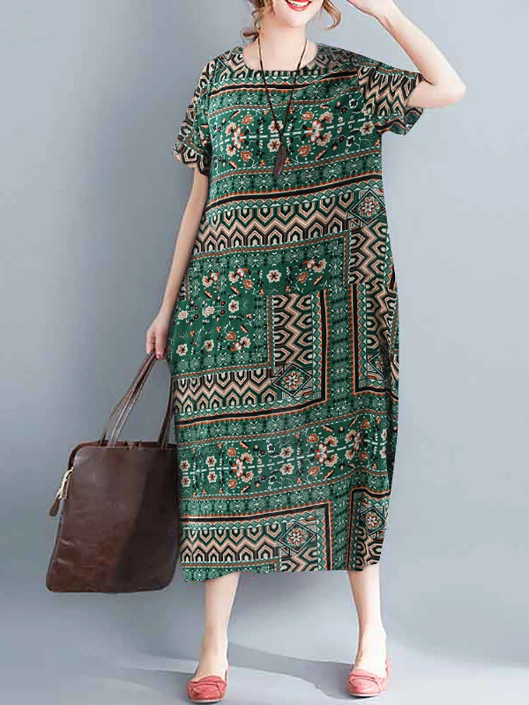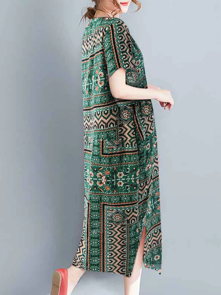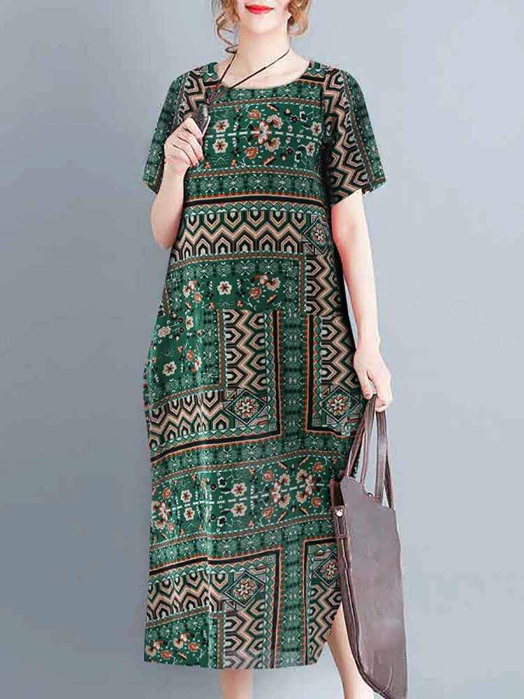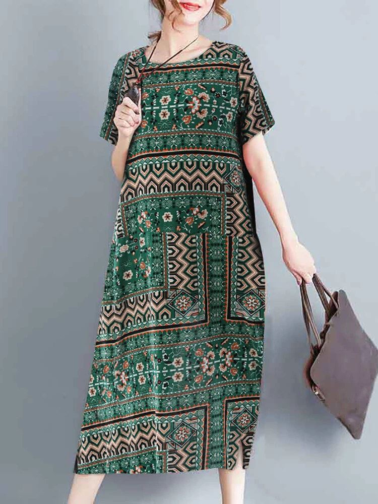 Color: Green, Red Style: Vintage Occasion: Everyday Material: Cotton, Linen Pattern: Tribal Season: Summer Collar: Crew Neck Hem Design: Slit Hem Sleeves Length: Short Sleeve Package Included:1*Dress
