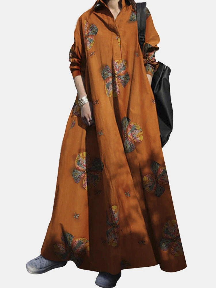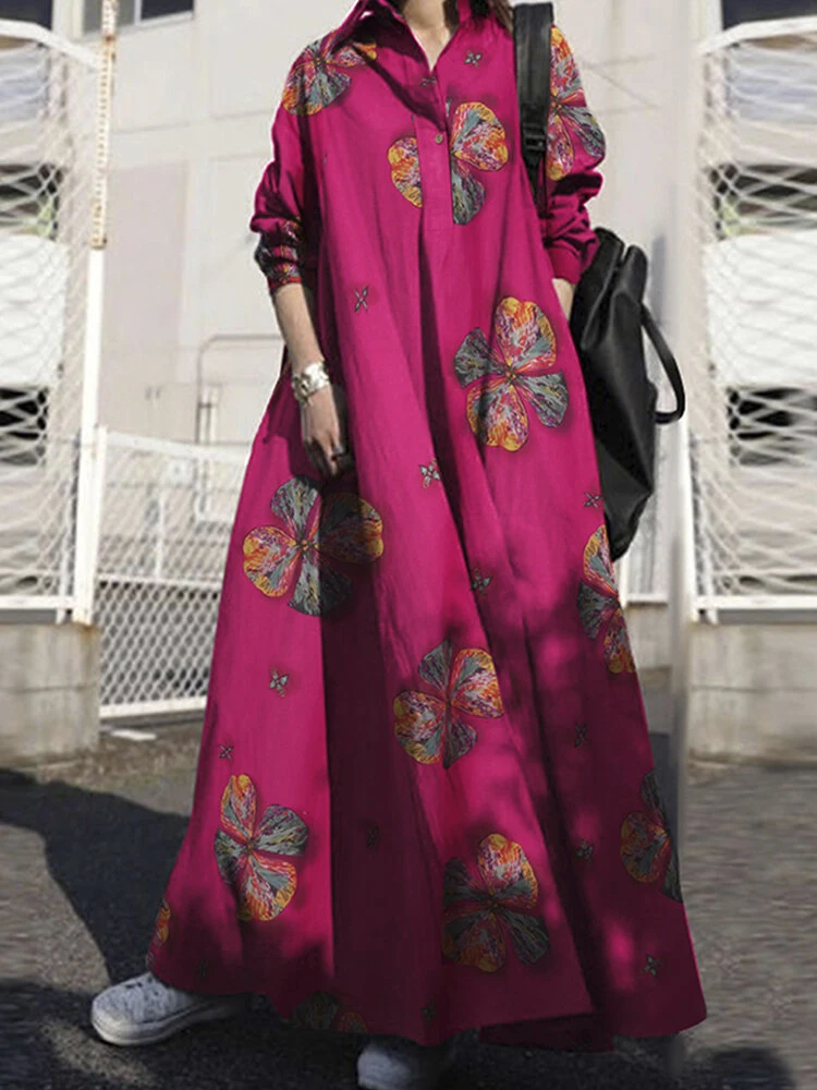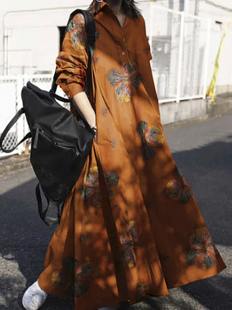 Vintage Floral Printed Big Swing Long Sleeve Pure Cotton Dress