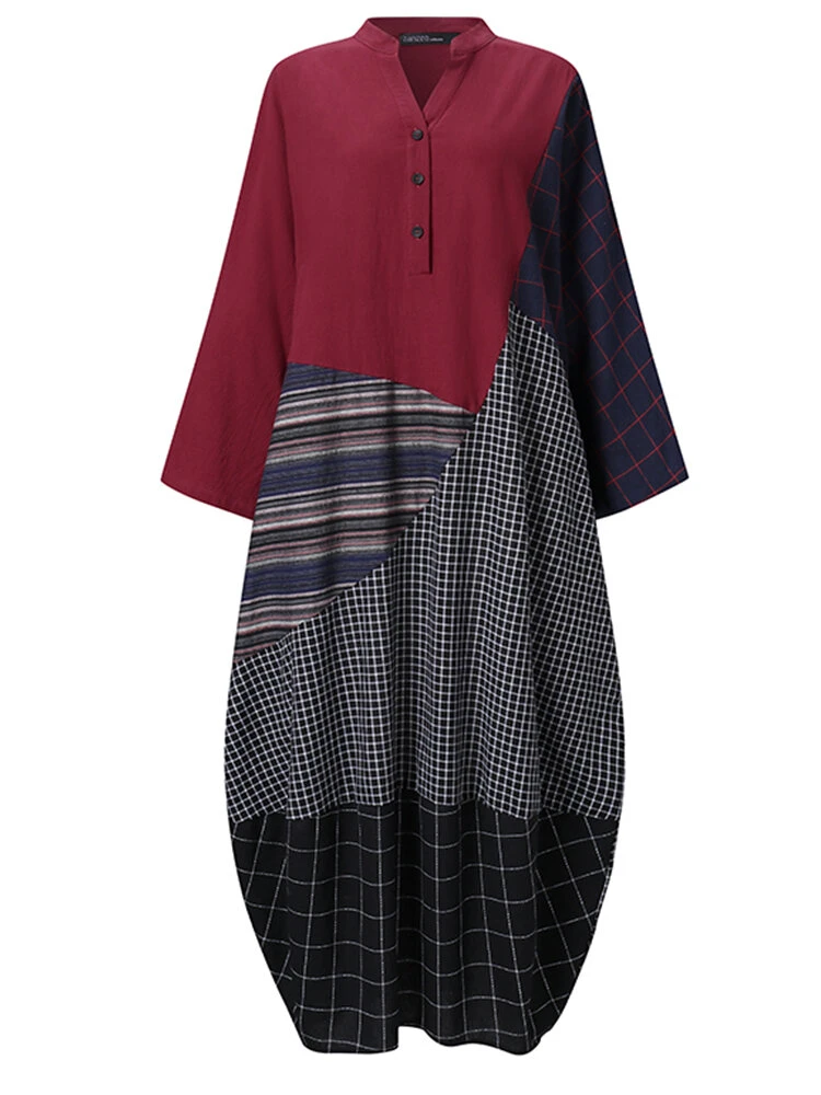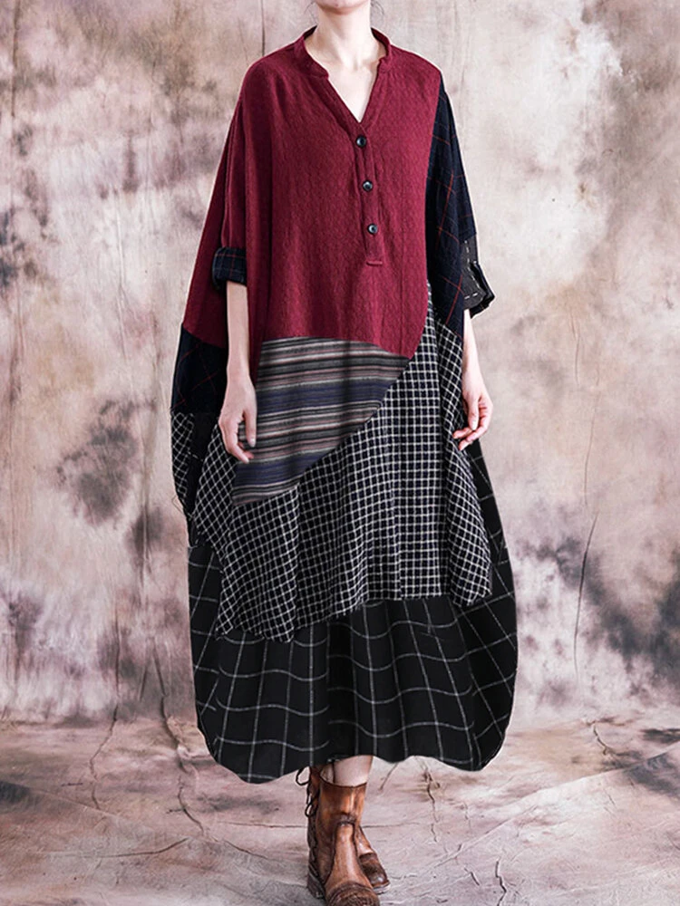 Vintage Striped Plaid Patchwork Plus Size Maxi Dress