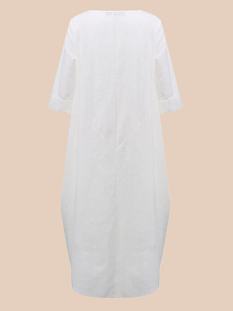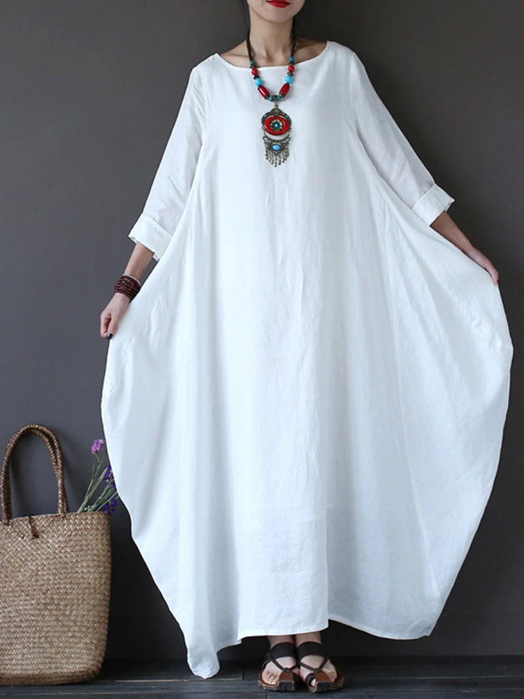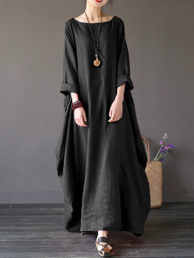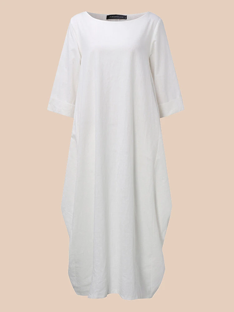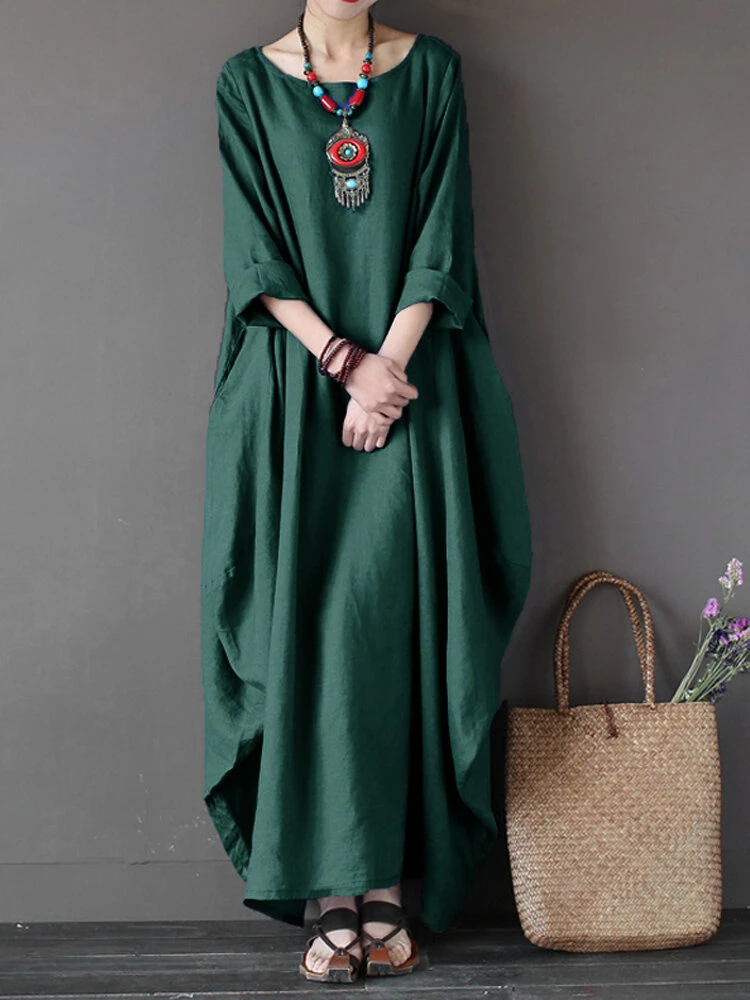 Vintage Women Solid 3/4 Sleeve Loose Maxi Dress With Pocket