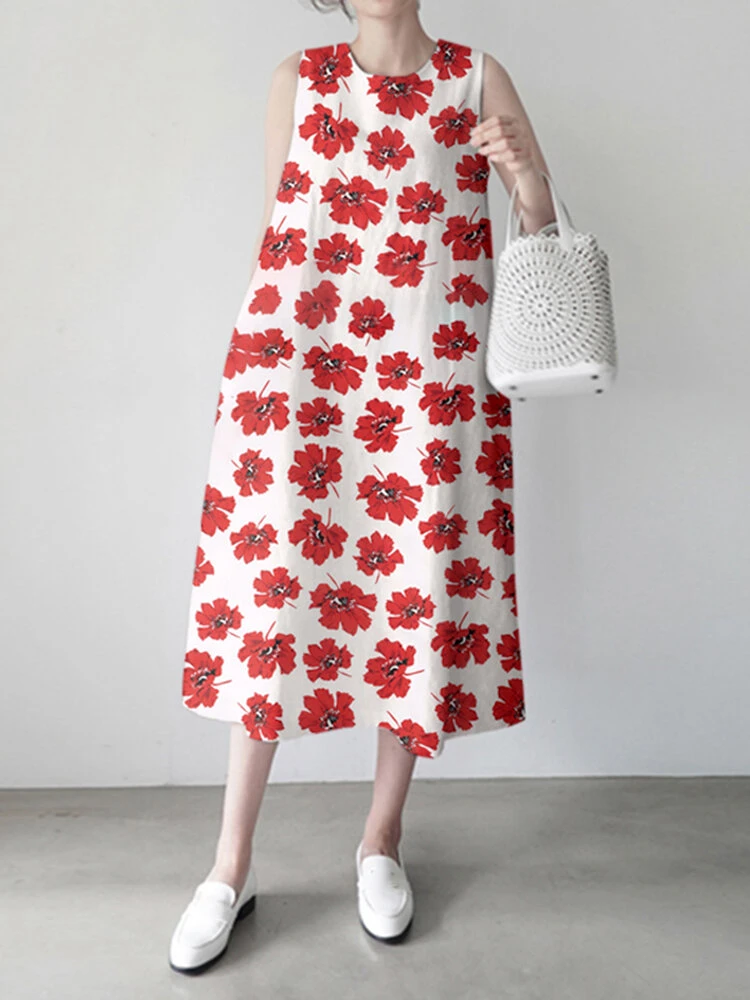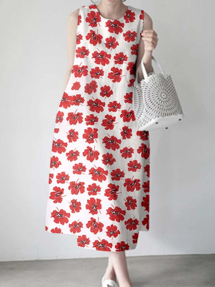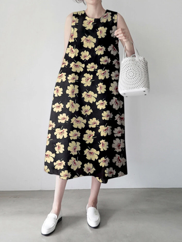 Women Allover Floral Print Crew Neck Sleeveless Dress