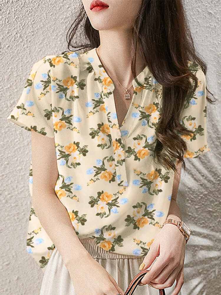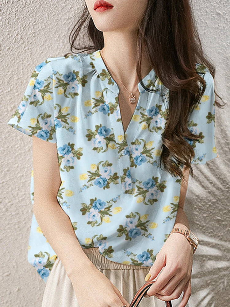 Color: Blue, Apricot, Black Material: Polyester Pattern: Floral Print Style: Casual Sleeves Length: Short Sleeve Sleeves Type: Regular Sleeve Fit Type: Regular Season: Summer Package Included:1*Blouse