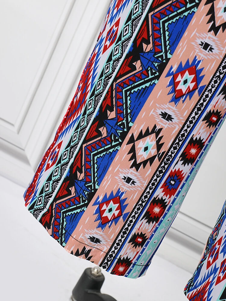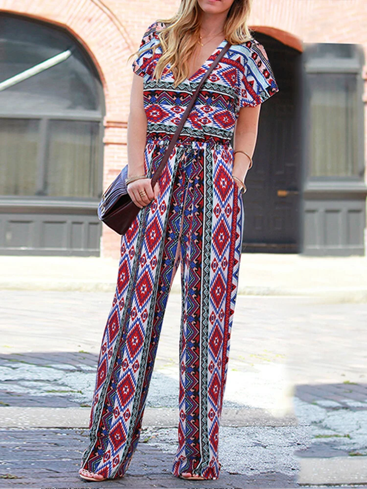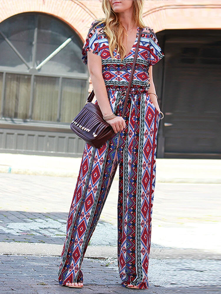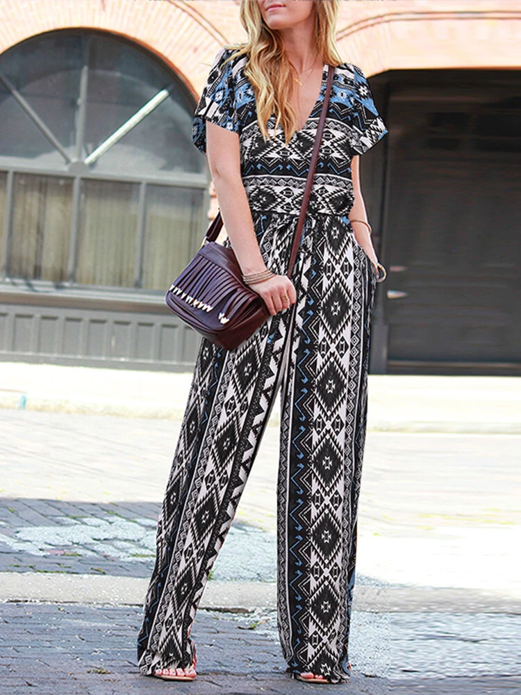 Women Bohemian Geometric Print V-Neck Short Sleeve Jumpsuit