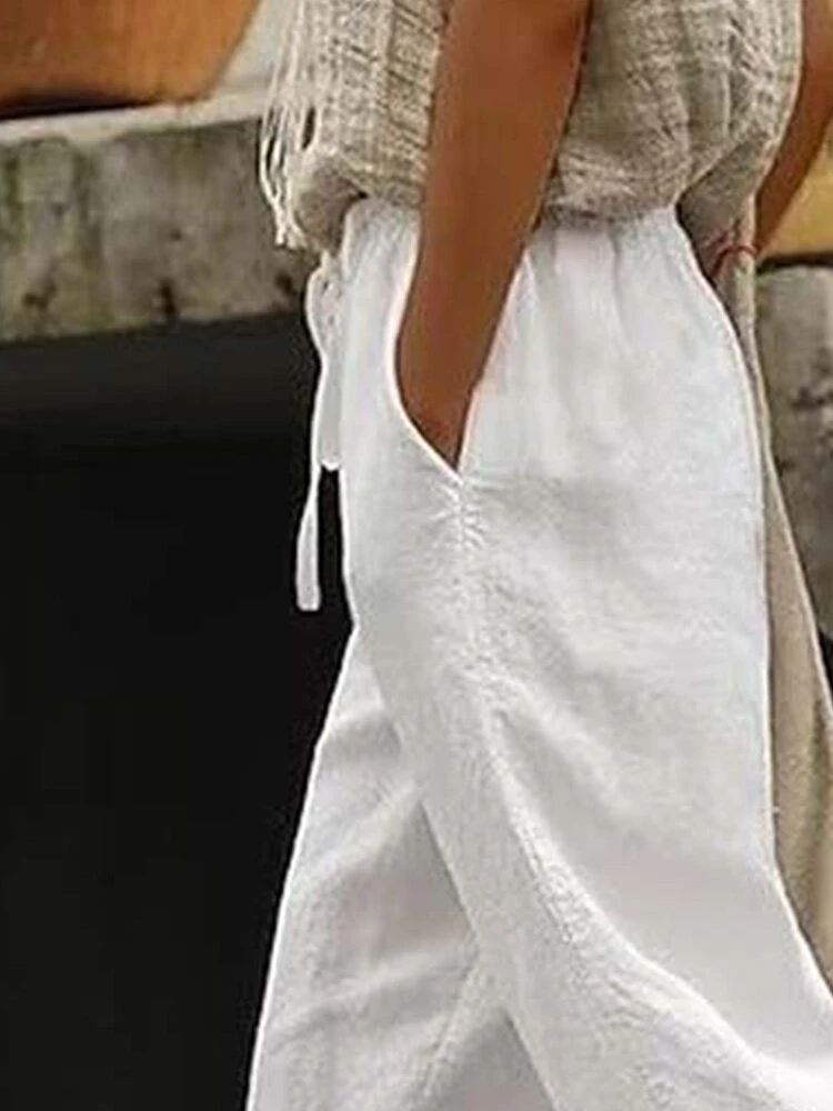 Color: White Material: Cotton Length: Cropped Pants Season: Summer Waist Design: Mid Waist Design Element: Pocket, Drawstring Style: Casual Fit Type: Regular Package Included:1*Pants
