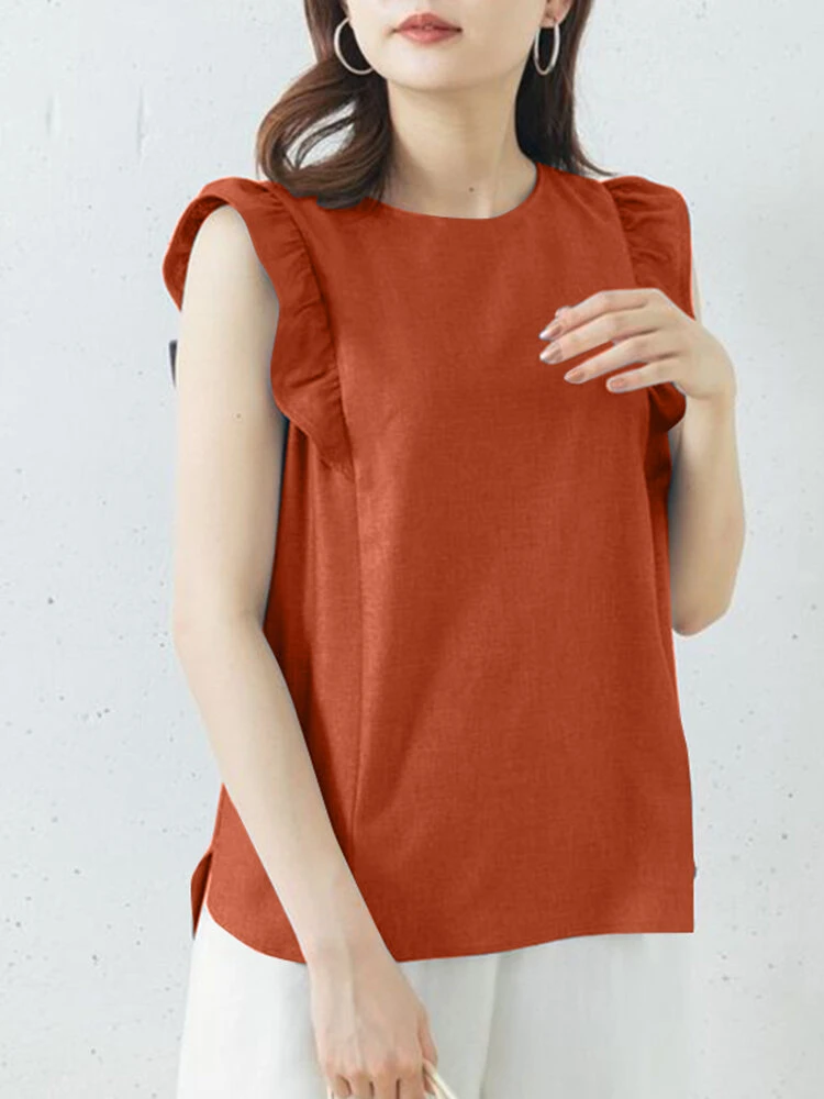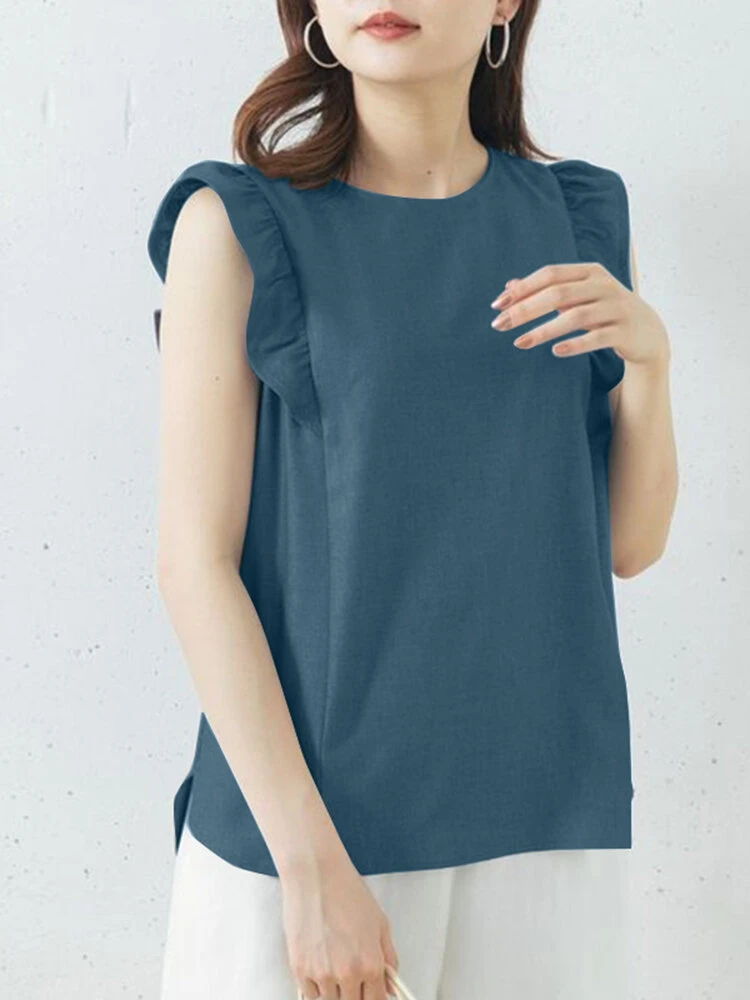 Women Cotton Ruffle Trim Sleeveless Side Split Tank Top
