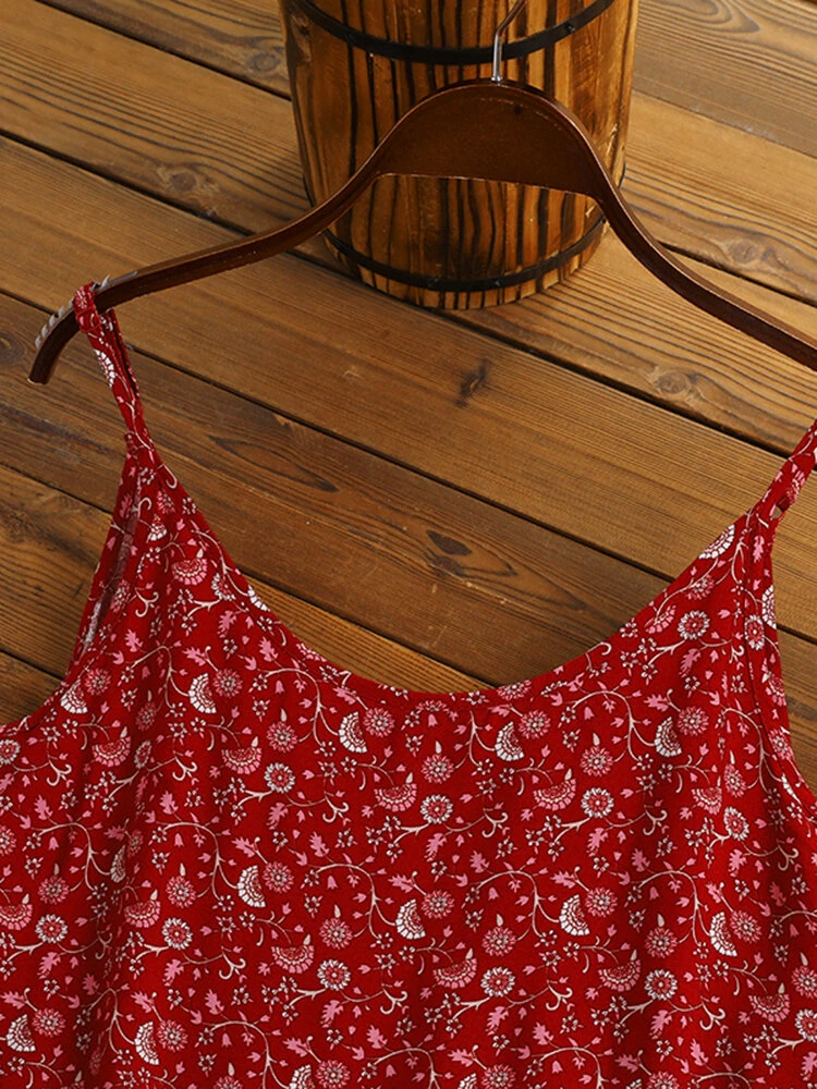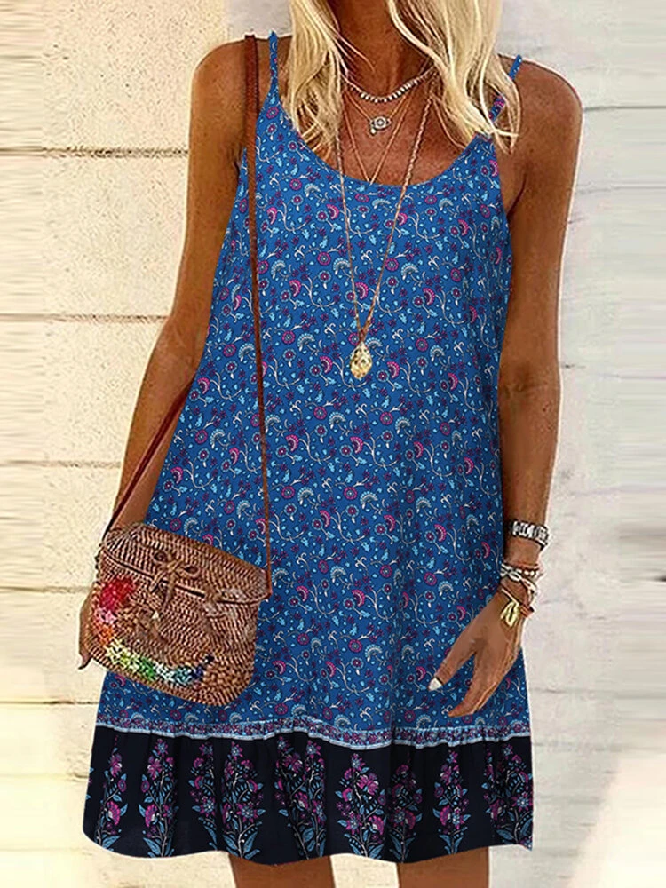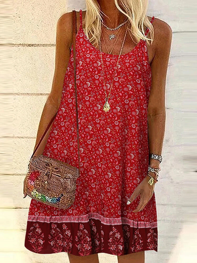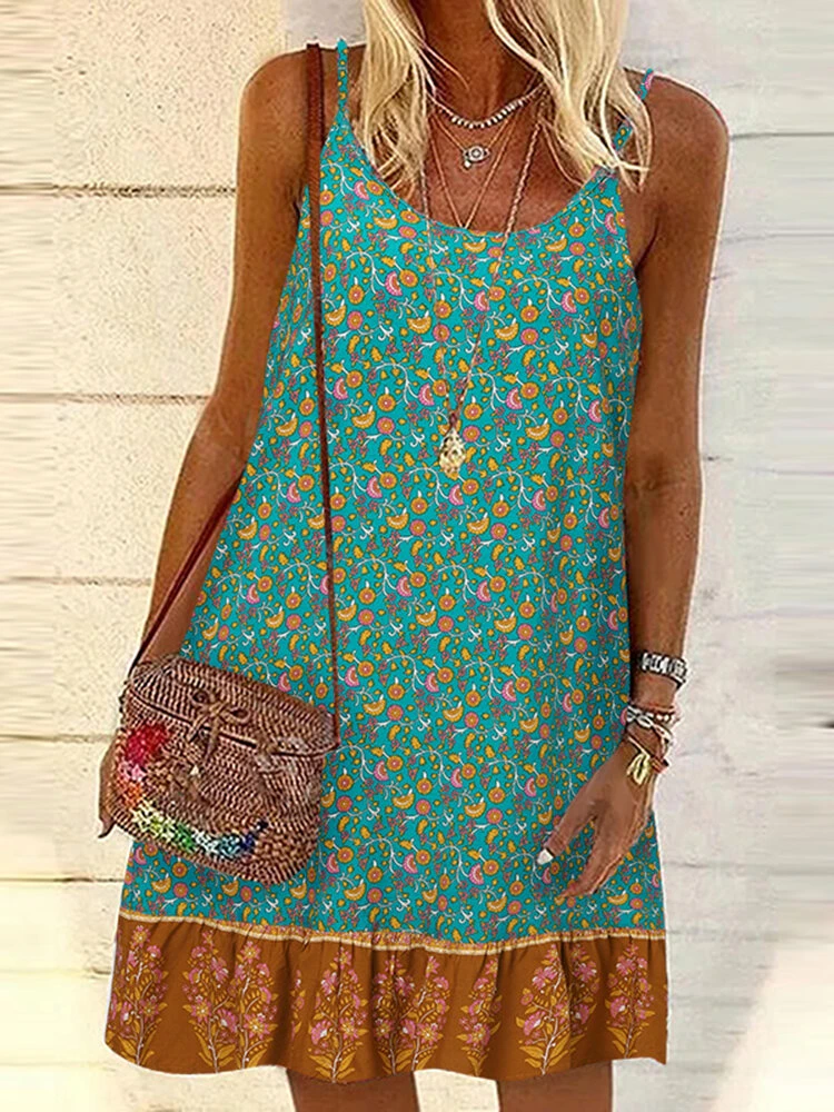 Color: Blue, Green, Red Style: Boho Occasion: Vacation Material: Rayon Pattern: Floral Print Season: Summer Collar: Spaghetti Strap Hem Design: Ruffle hem Sleeves Length: Sleeveless Fit Type: Regular Package Included:1*Dress