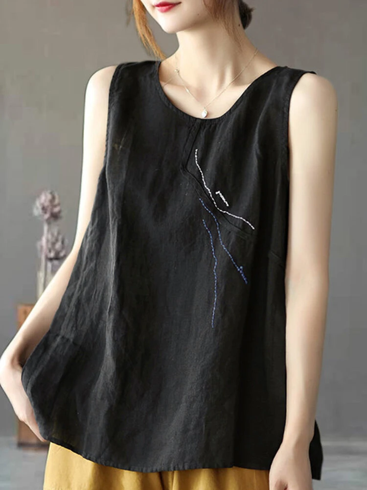 Women Embroidery Crew Neck Sleeveless Vintage Tank Top