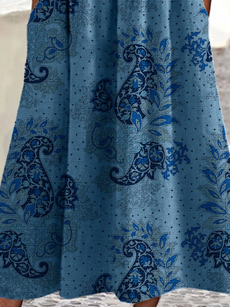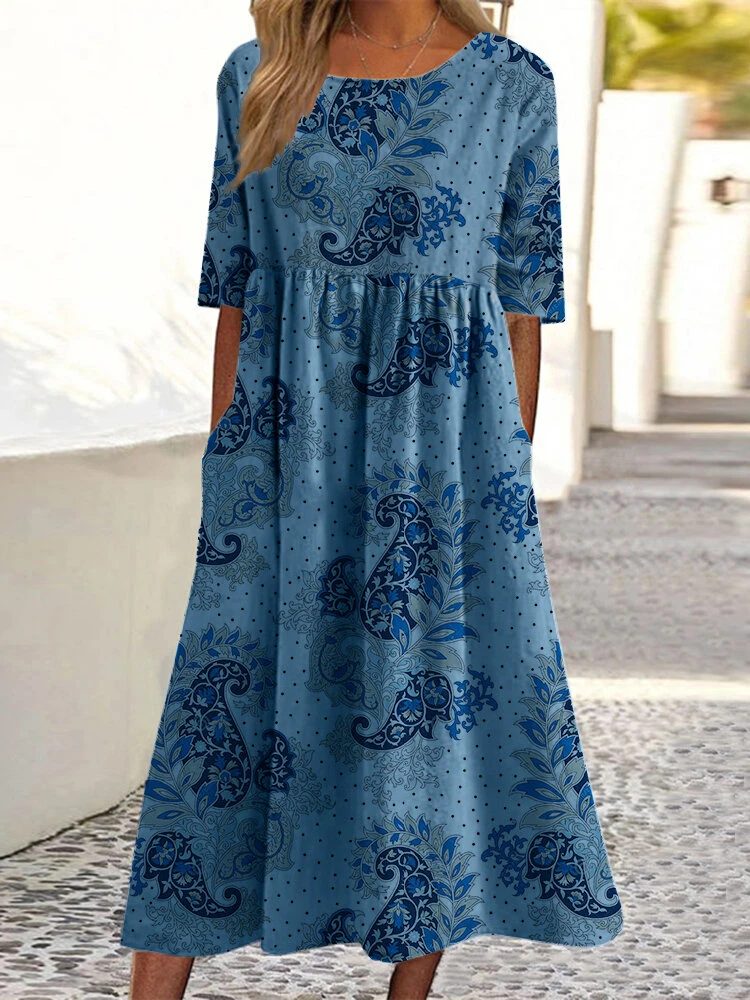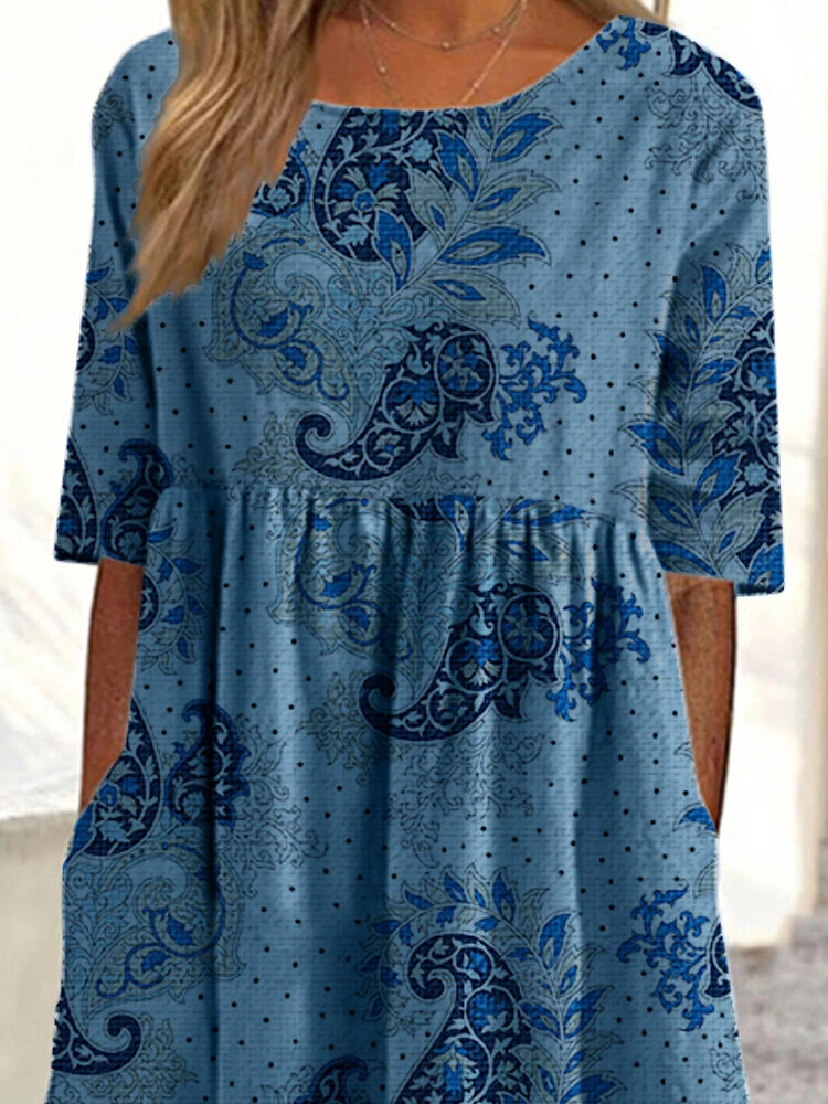 Color: Blue, Blue Style: Ethnic, Ethnic Occasion: Everyday, Everyday Material: Polyester, Polyester Pattern: Paisley Print, Paisley Print, Polka Dot, Polka Dot Design Element: Pocket, Pocket Season: Summer, Summer Collar: Crew Neck, Crew Neck Hem Design: Regular Hem, Regular Hem Sleeves Length: Half Sleeve, Half Sleeve Sleeves Type: Regular Sleeve, Regular Sleeve Fit Type: Regular, Regular Package Included:1*Dress