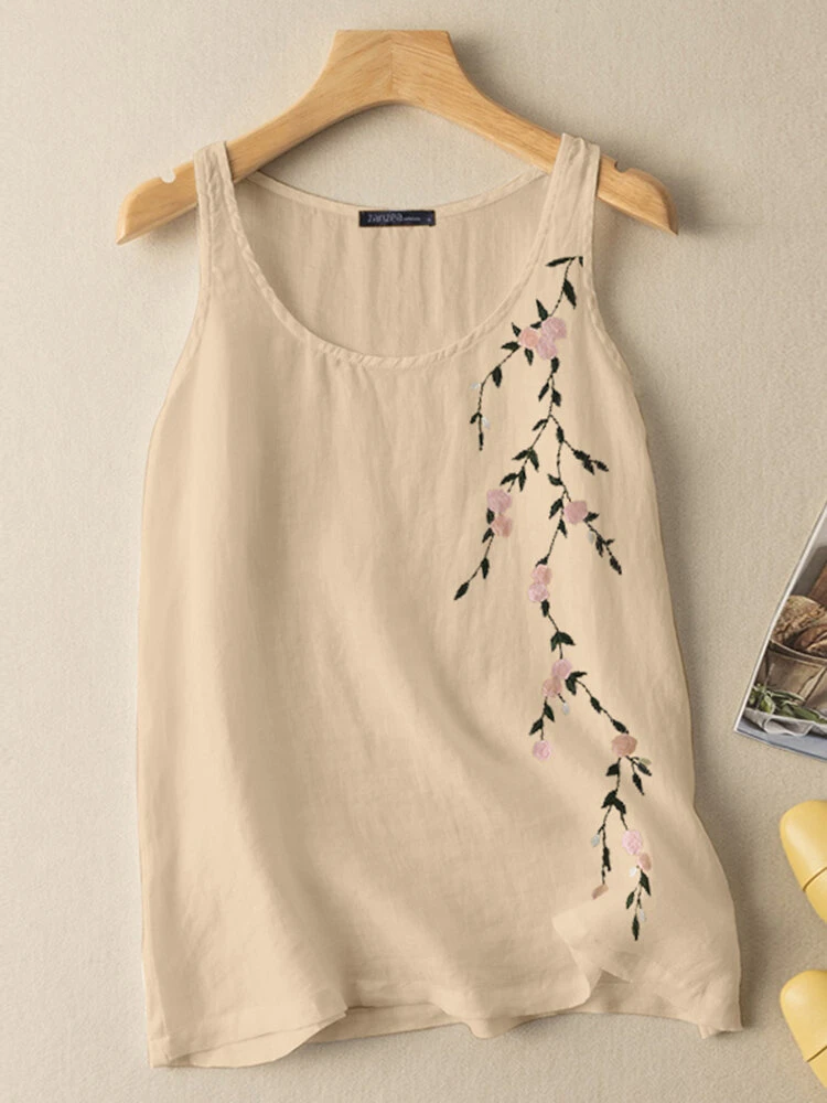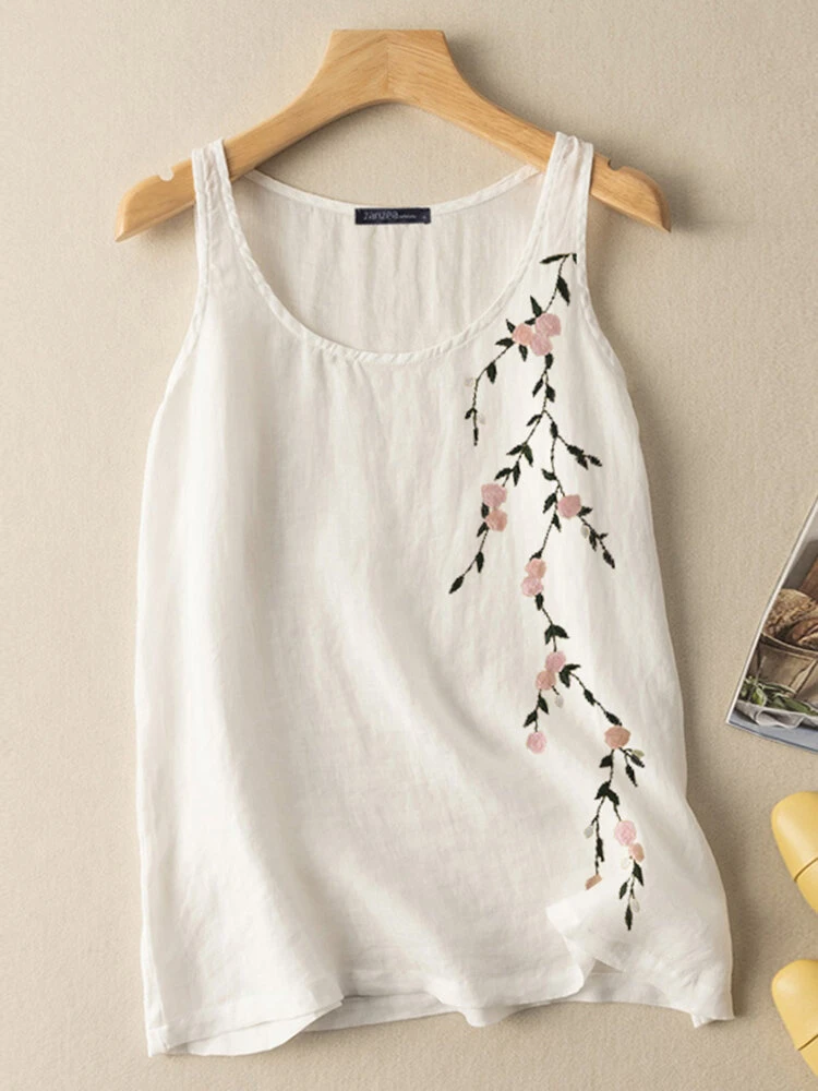 Women Floral Embroidered Crew Neck Cotton Sleeveless Tank Top