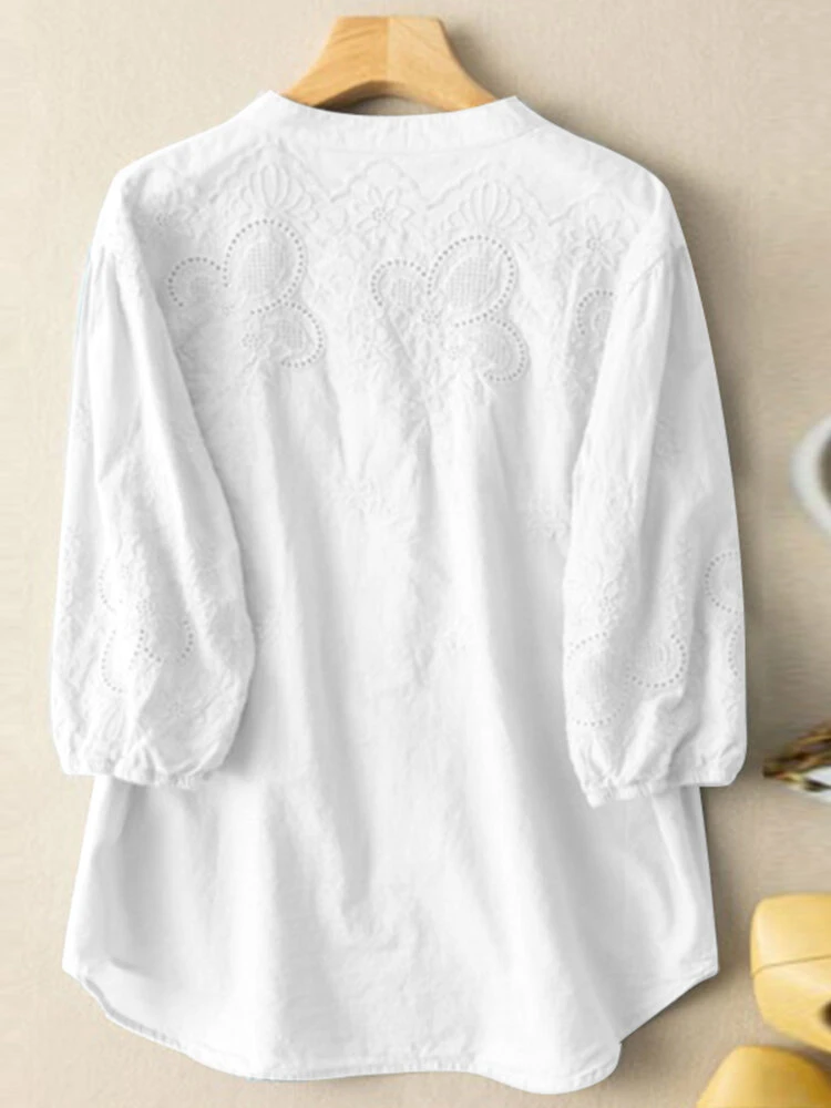 Women Floral Jacquard Stand Collar Button Up Cotton Shirt