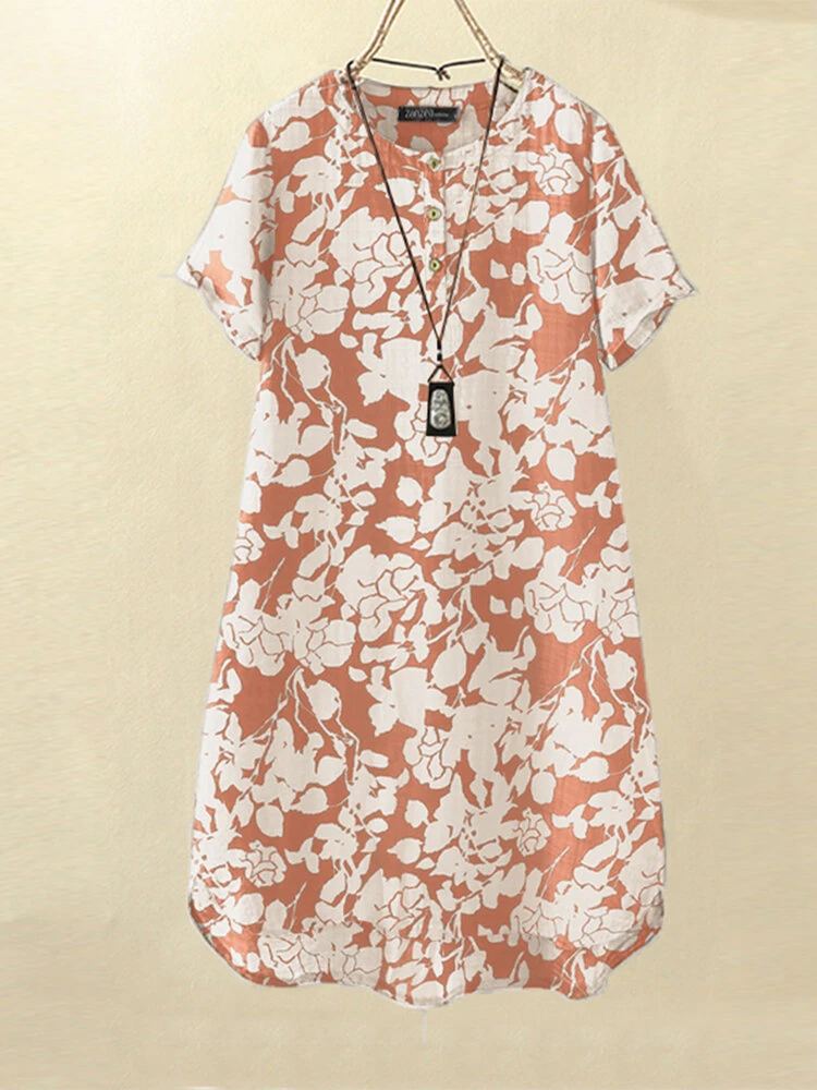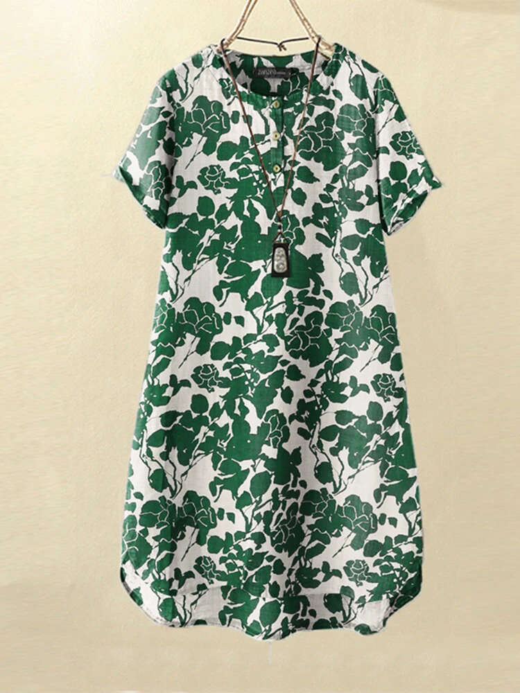 Women Floral Plant Print Quarter Button Vacation Short Sleeve Dress