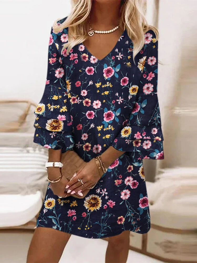 Women Floral Print V-Neck Layered Bell Sleeve Dress