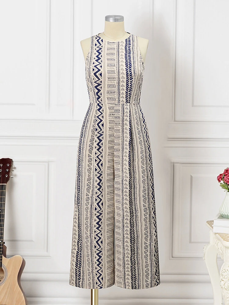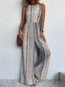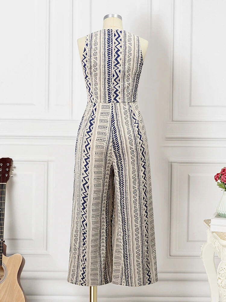 Women Geometric Print Crew Neck Sleeveless Bohemian Wide Leg Jumpsuit