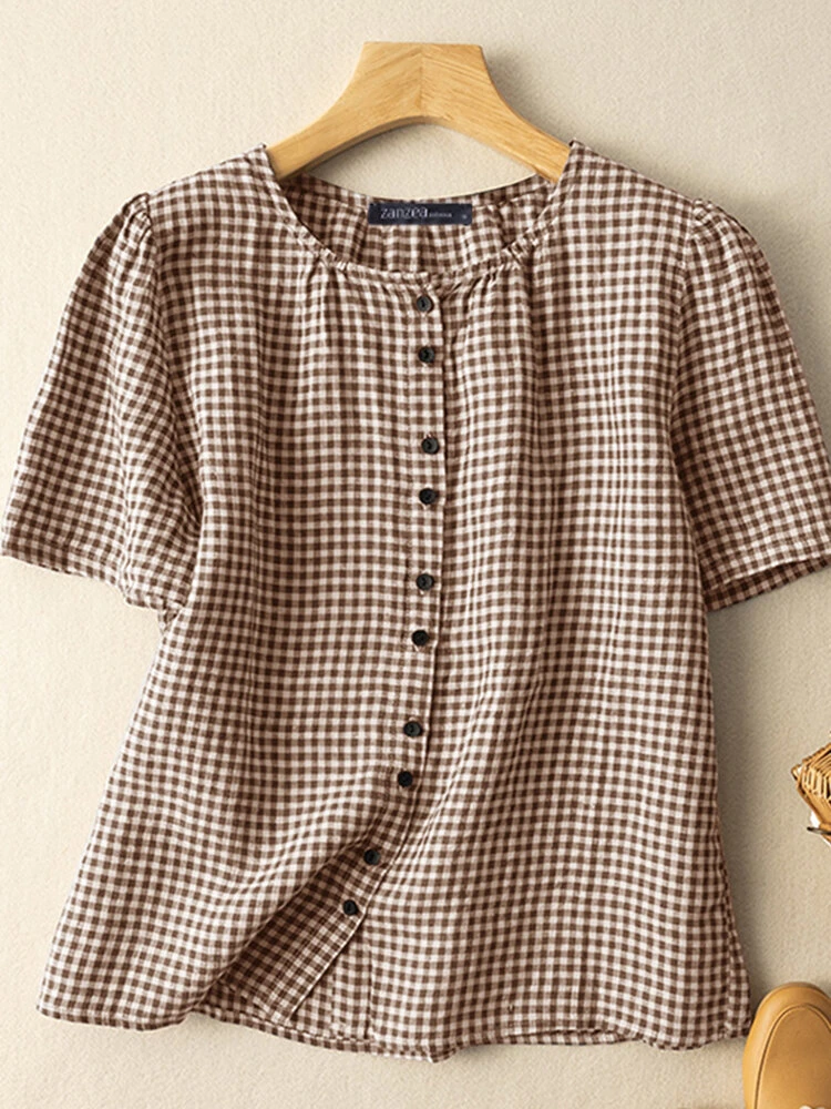 Color: Khaki, Blue, Black Material: Cotton, Polyester Pattern: Plaid Style: Casual Sleeves Length: Short Sleeve Sleeves Type: Regular Sleeve Fit Type: Regular Season: Summer Package Included:1*Blouse