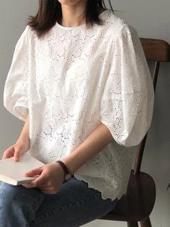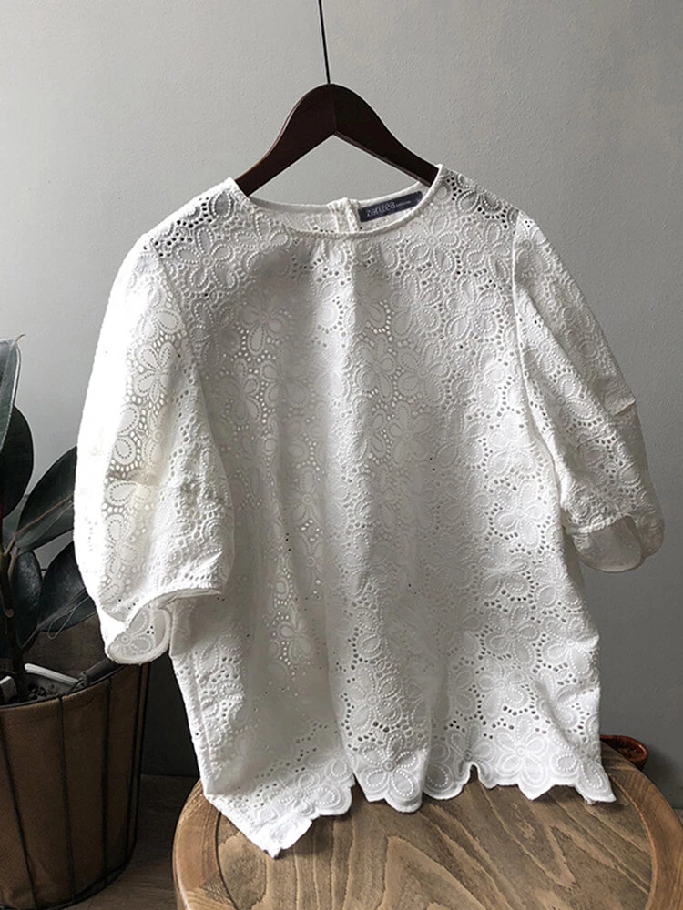 Women Guipure Crew Neck Cotton Lantern Sleeve Blouse