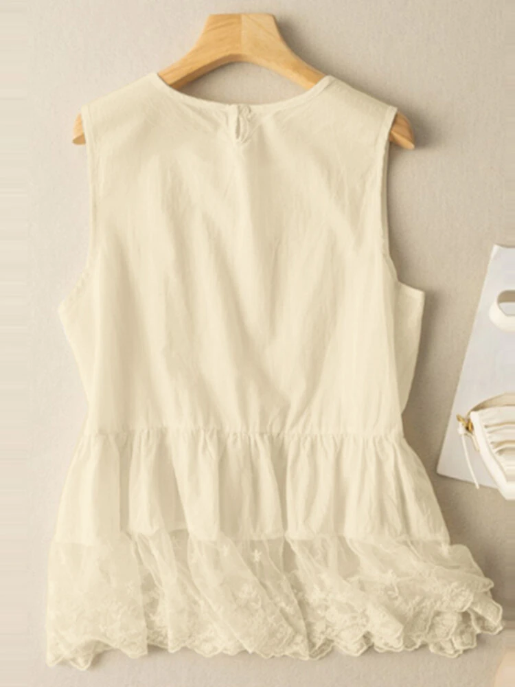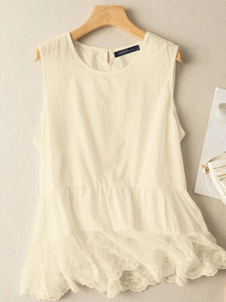 Women Lace Patchwork Hem Crew Neck Sleeveless Tank Top