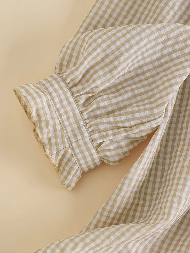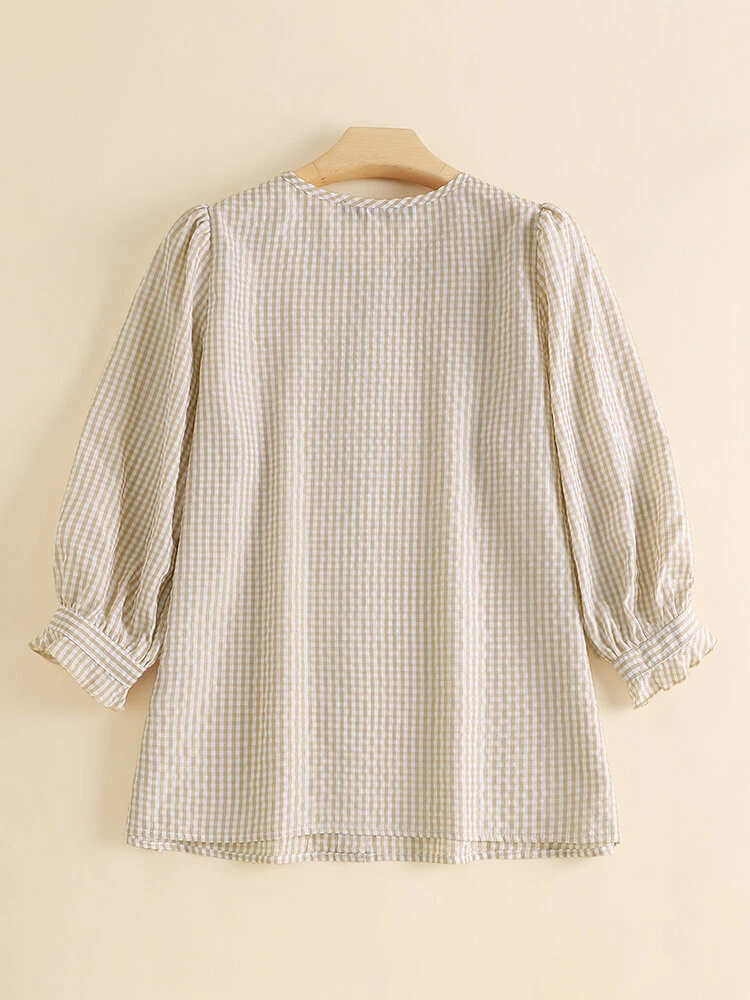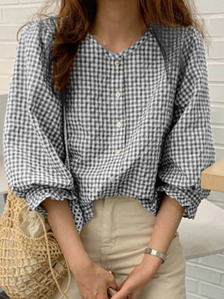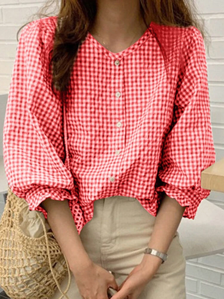 Color: Khaki, Red, Black Material: Polyester Pattern: Plaid Occasion: Everyday Style: Casual Sleeves Length: 3/4 Length Sleeve Sleeves Type: Puff Sleeves Fit Type: Regular Season: Autumn Design Element: Button Front Hem Design: Regular Hem Length: Regular Placket Type: Placket Package Included:1*Shirt