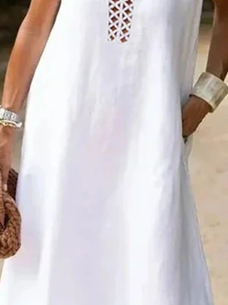 Women Plain Hollow Out V-Neck Cotton Sleeveless Dress