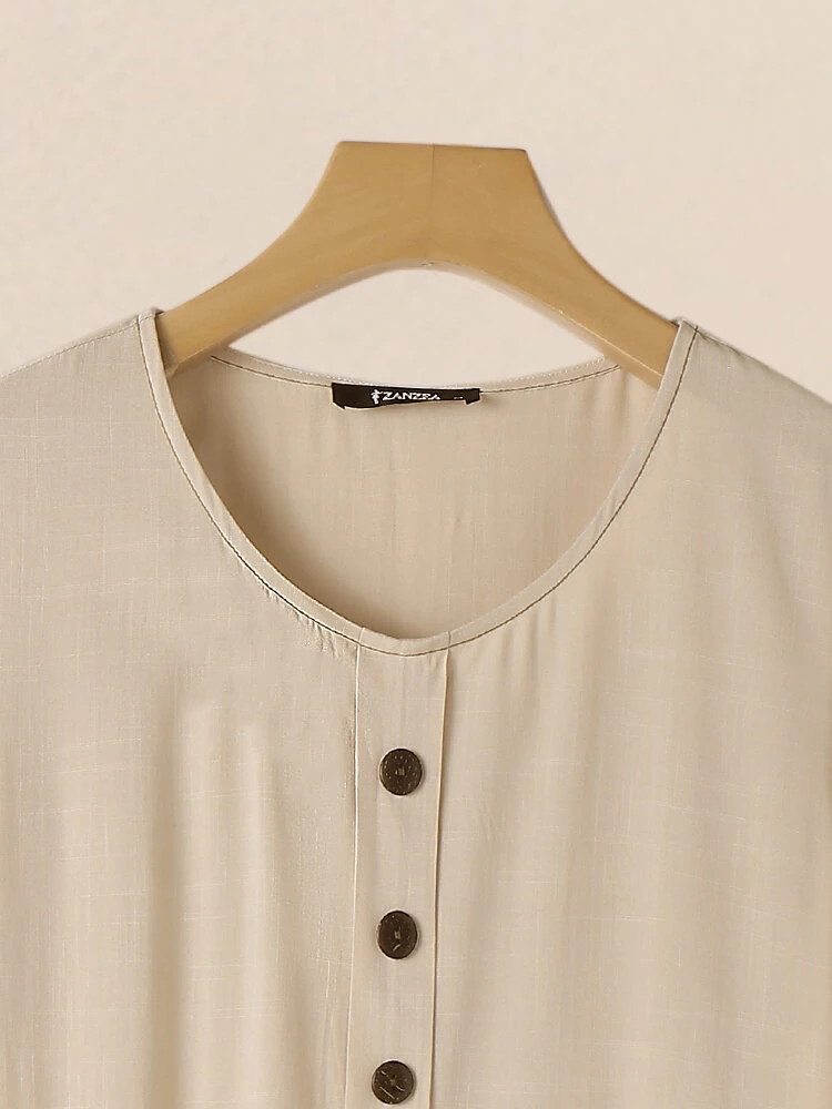 Color: Khaki Style: Casual Occasion: Everyday Material: Cotton Pattern: Plain Design Element: Button Front Season: Summer Collar: Crew Neck Sleeves Length: Short Sleeve Sleeves Type: Regular Sleeve Fit Type: Regular Package Included:1*Dress