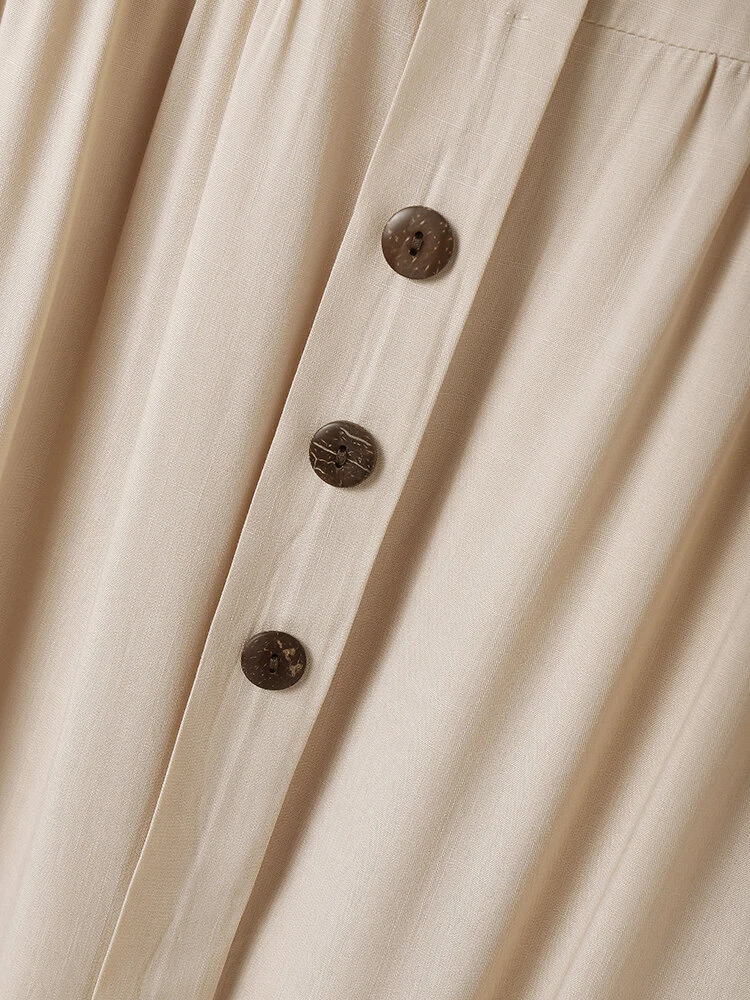 Women Plain Texture Button Front Cotton Short Sleeve Dress