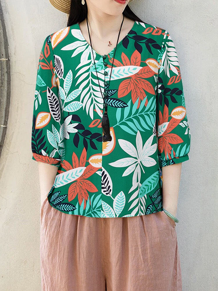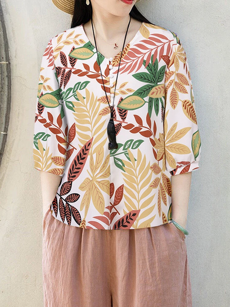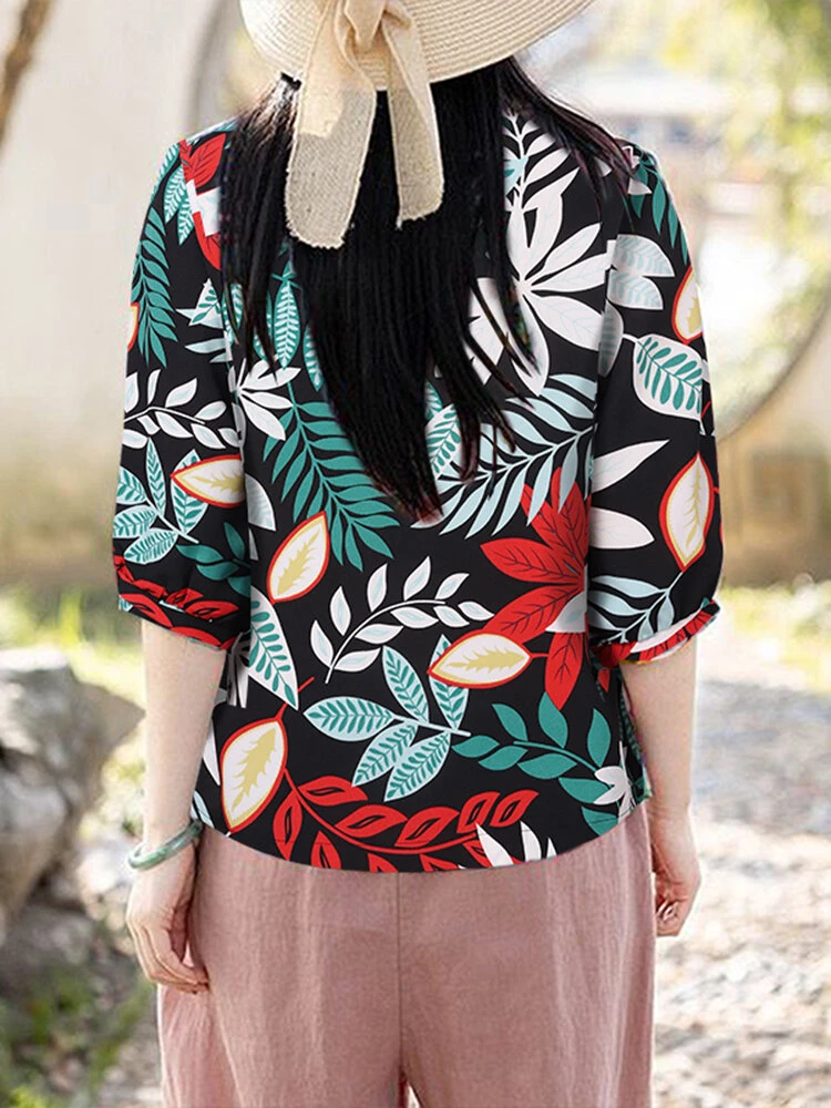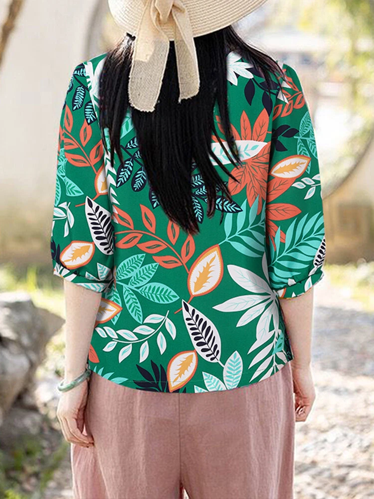 Women Plant Leaf Print V-Neck Half Button Vacation Blouse