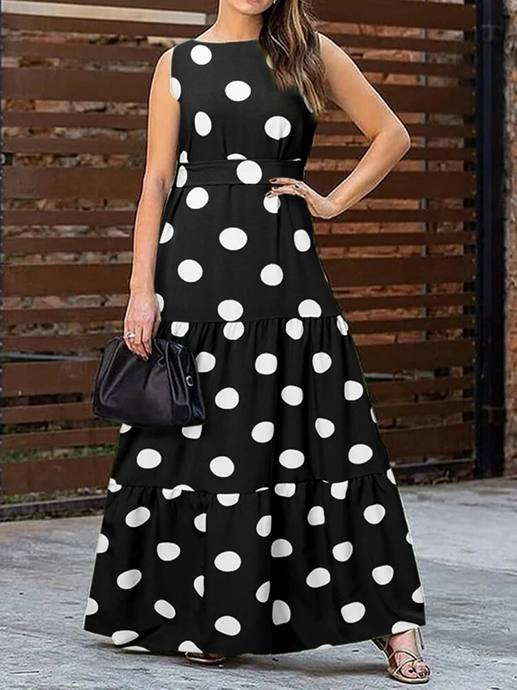 Women Polka Dot Tiered Tie Back Sleeveless Maxi Dress