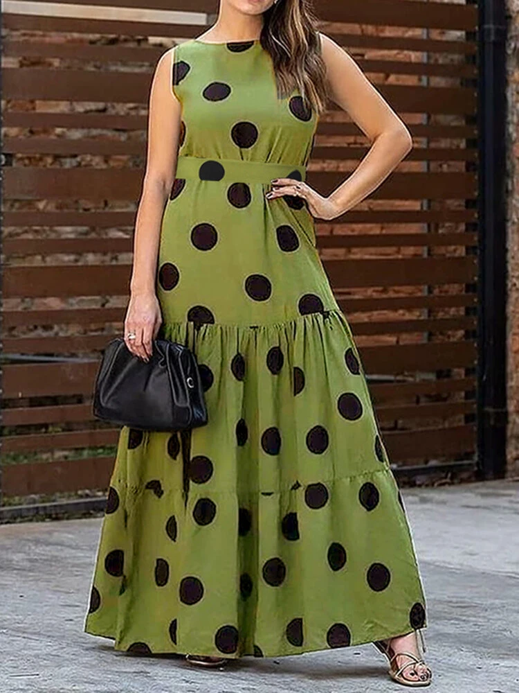 Color: Black, Green, Yellow Style: Casual Occasion: Everyday Material: Polyester Pattern: Polka Dot Design Element: Tiered Season: Summer Collar: Crew Neck Sleeves Length: Sleeveless Length: Maxi Fit Type: Regular Package Included:1*Dress