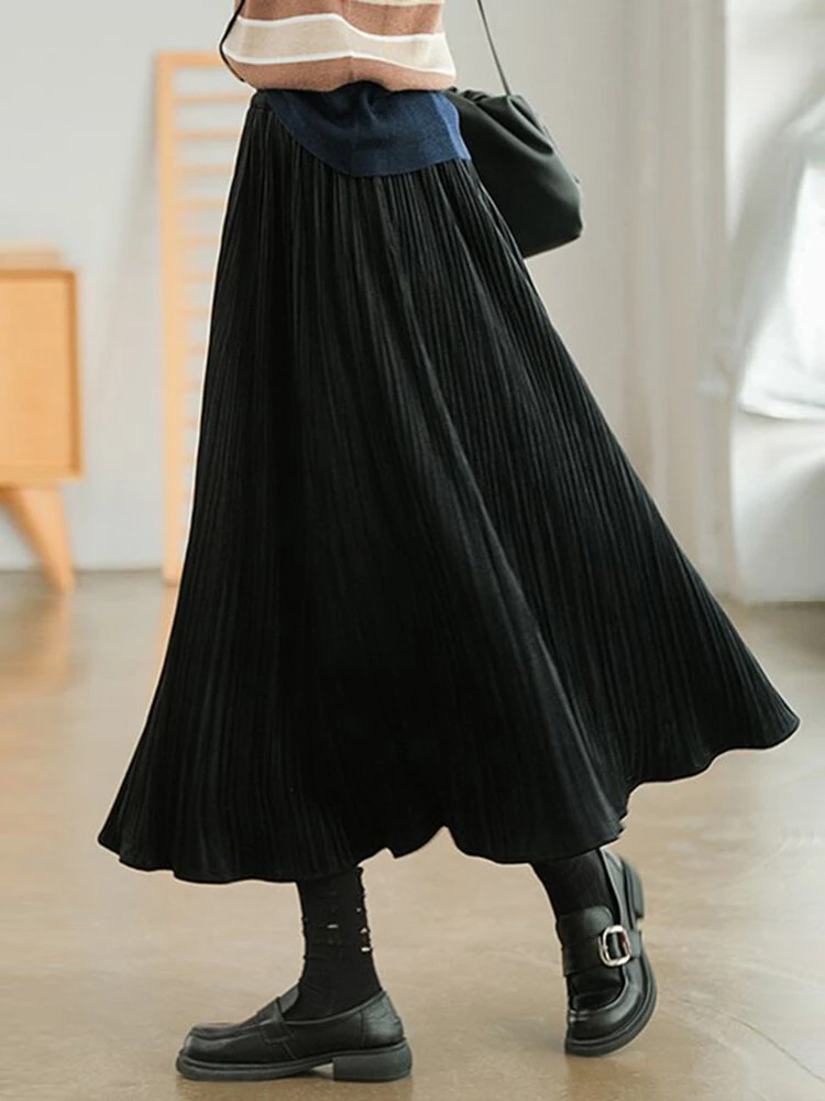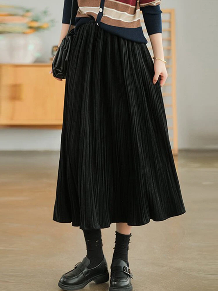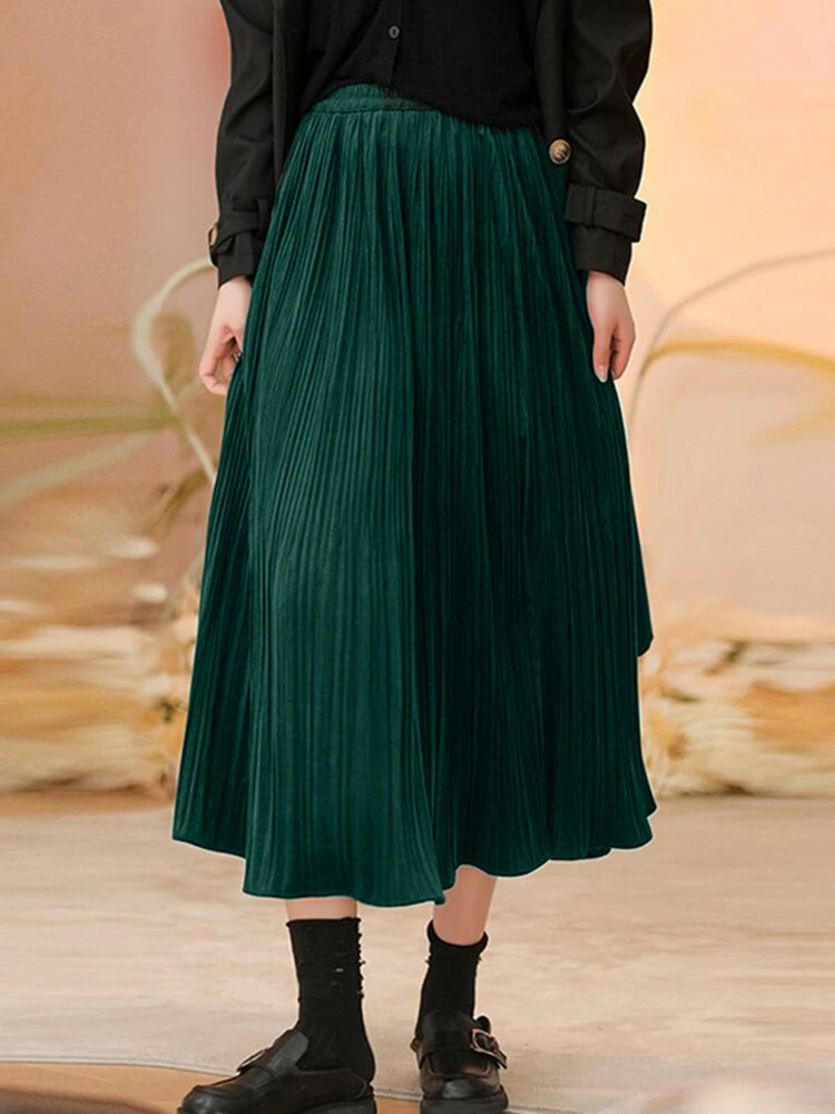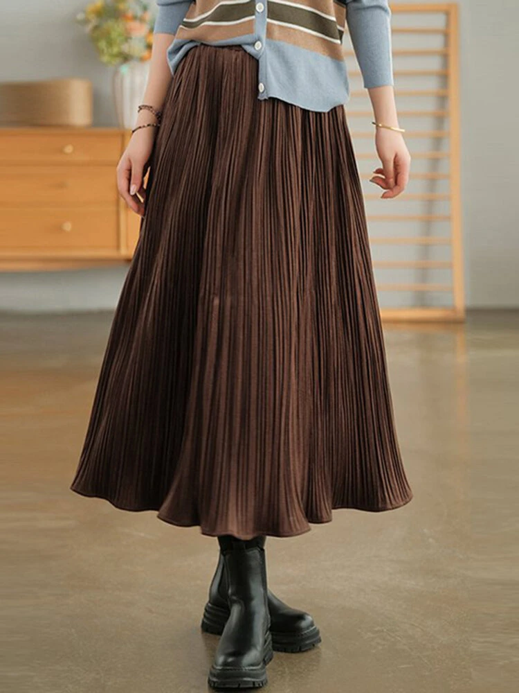 Women Solid A-line Casual Pleated Elastic Waist Skirt