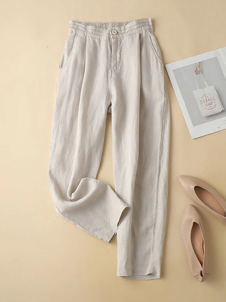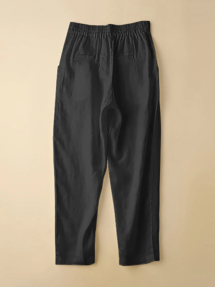 Women Solid Color Cotton Casual Pants With Pocket