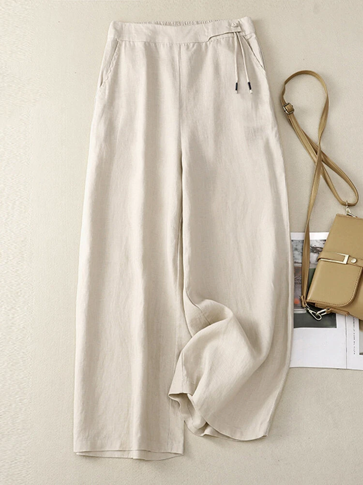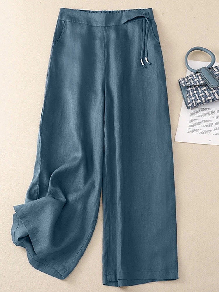 Women Solid Cotton Casual Wide Leg Pants With Pocket