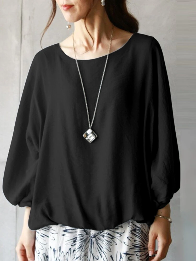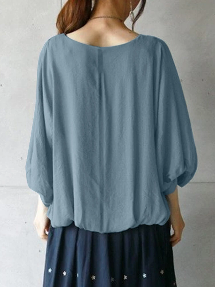 Women Solid Crew Neck Casual 3/4 Sleeve Blouse